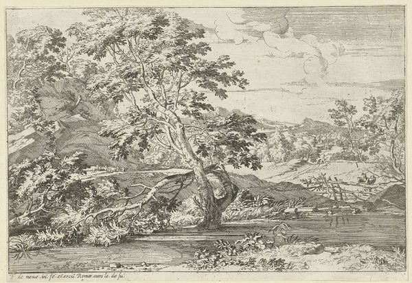Curator: Welcome. Before us is "Boomrijk landschap met figuren," a lush landscape attributed to Cornelis Danckerts I, though its dating remains somewhat uncertain, circa 1614-1683. It’s an engraving. Editor: It has an instantly calming feel. The composition, contained within that perfect circle, the tonal range, and the detail… it almost feels like I’m peering through a lens at a miniature world. Curator: That circular frame definitely emphasizes a particular worldview, doesn't it? The artist uses the genre painting theme with the detailed renderings of figures traveling through nature to engage collective fantasies and emotional concepts of landscape in the Dutch Golden Age. Consider these visual symbols of movement, aspiration, and human existence in harmony. Editor: Absolutely. Notice how the artist employs cross-hatching to achieve the modeling—such detailed linework. See, too, the arrangement of dark and light that emphasizes that road. The light gives the eye a sense of narrative depth, beckoning you further into the piece. Curator: That pathway becomes not merely a road but an emblem of the human journey—an archetype reflected in many artistic traditions across time. Look closely and one may see representations of personal growth. Editor: Maybe, but from a compositional point of view, the strategic positioning of these travelers encourages us to see how forms interact and define spatial relations within the work. Curator: Agreed, but let’s not ignore how the placement of people in this 'Boomrijk landschap’ impacts its underlying significance—consider that each one carries associations of individual agency while reflecting societal position, offering insights into cultural dynamics during that era. It is this interplay that grants it its psychological depth. Editor: Ultimately, Danckerts uses the vocabulary of line and form to construct a believable world, a self-contained pictorial plane, a space that reflects art itself and can also become deeply symbolic for a viewer like you. Curator: Perhaps you're right! What Danckerts presents allows an entry point for reflecting upon the complex relationships binding culture and identity through the visual realm itself! Editor: Indeed.