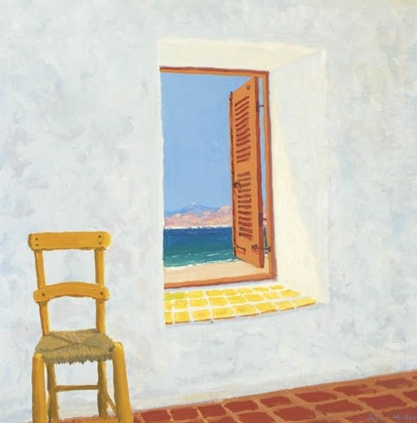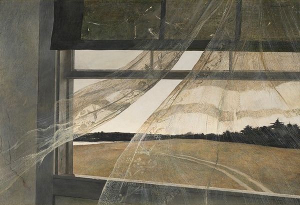 Editor: We're looking at Bo Bartlett's "The End of Summer" from 2006, an oil painting that depicts a view through a window. I'm struck by how the geometric shapes of the window frame and the building outside create a sense of order and containment. What compositional elements stand out to you? Curator: The articulation of space through the window’s grid is quite deliberate. Notice how Bartlett frames the external world – specifically, the architecture and a sliver of the sea – within a tight, almost classical structure. It begs the question: how does this rigorous framing influence our perception of what lies beyond the glass? Consider also the interplay between the cool exterior light and the implied warmth within the room, further articulated by the shadows on the left side. Editor: That’s fascinating. It almost feels like the window itself is another character in the painting, mediating between the viewer and the scene. How does the texture of the paint contribute to this feeling? Curator: The textures, albeit subtly rendered, play a significant role. Observe the smooth, almost ethereal rendering of the sky compared to the slightly rougher, tactile quality of the building's shingles and the weathered wood of the window frame. This differentiation, through textural variation, adds depth and realism to the composition, highlighting the materiality of both the exterior and interior elements. Editor: So, it’s not just about what we see, but how we see it, thanks to the painter's choices. I will certainly look more deeply into the structure of a painting from now on. Curator: Precisely! The painting invites us to consider the framework through which we perceive reality. A valuable lesson in the language of art, indeed.