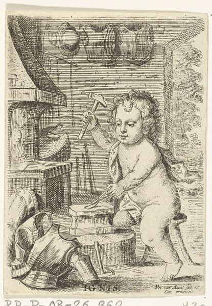 Curator: Here we have a drawing called "Cupid with a Bird on a String," attributed to Joseph Werner the Younger and estimated to have been created sometime between 1637 and 1710. It is executed in ink on paper. Editor: There's a disquieting stillness to this piece, even with Cupid's animated gesture. The restricted tonal range creates an atmosphere that almost verges on melancholy. Curator: The dynamism in the drawing certainly comes from Cupid's reach toward the bird and the diagonal pull of the string. Note how the Baroque style employs asymmetry and implied movement. Semiotically, we see an allegory here, as Cupid, the god of love, controls the bird. It’s a power dynamic portrayed rather subtly. Editor: It also reflects the socio-political hierarchy in viewing pleasure. The upper classes might have delighted in the suggestion that love, like a pet, could be captured or dominated, which resonates with the power imbalances that were very common in the 17th century. How do you view the staging of this work? Curator: The staging is fascinating. The artist establishes a complex, architecturally defined space, then sets this allegorical action within it. This emphasizes the role of environment in defining identity and influence, both of Cupid and his potential “prey.” But there’s a detachment from realism, with focus placed instead on forms and gestures as a type of visual code. Editor: Right, that detachment speaks volumes, the drawing also provides a perspective on the consumption and display of artworks. Patrons would likely have commissioned or collected pieces like these to demonstrate cultural literacy and refine tastes in a drawing room such as the one presented in this scene. Curator: Absolutely, and viewed through a purely formalist lens, the effectiveness resides in how line, light, and composition merge to evoke emotion through structured artifice. Editor: And on an ending note, to consider these artistic intentions within their historical setting brings depth and reminds us that this drawing is not simply an image but is, in fact, a statement within society and culture. Curator: A statement that's eloquently translated into artistic expression using all its constituent pieces and how the viewer responds to it visually.
