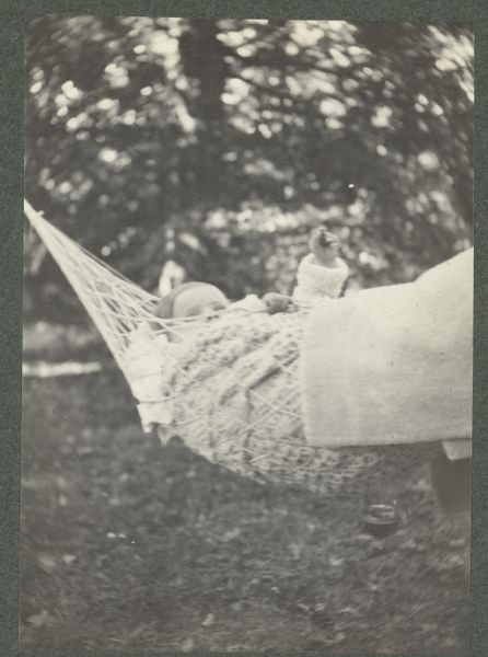 Curator: Here we have Geldolph Adriaan Kessler’s "Moeder en dochter zitten op het gras, Landgoed De Paauw," dating from around 1913. It's currently held in the Rijksmuseum collection. Editor: It has this very somber feel. Almost like a lost memory, wouldn't you say? The limited tonal range gives it a haunting, timeless quality. Curator: It’s definitely evocative. Kessler was part of a movement pushing photography toward art—embracing ‘plein-air’ techniques. These outdoor portraits showcase a deliberate blurring of lines, literally and figuratively, between traditional landscape painting and portraiture within the burgeoning market for photography. Editor: Interesting. The formal elements create a rather strong composition though, even with that blurriness. Look at the way the large dark tree in the background creates an upper frame, grounding the subjects below. The contrast emphasizes their smallness within the broader landscape. Curator: Absolutely, and that composition highlights the changing role of women and children within that societal landscape. We see an emphasis on leisure and the performance of domesticity within the upper classes of the early 20th century, a construction facilitated by technological advancements in camera production and photographic printing. Editor: So, do you see it commenting on labor, leisure, class? To me, it reads more like an exploration of light and form through a specific photographic lens, which emphasizes shape and spatial relationships over clarity of detail. The subjects become textural components, like brushstrokes, within the larger scene. Curator: But consider the materials themselves. Early photographic processes involved significant labor—from preparing the chemicals to developing the print. Kessler’s choices, made possible through advancements in industrial chemistry, point toward wider questions around artistic value. Editor: That's interesting food for thought. All these layers of artistic process, family identity and also nascent capitalism make for a wonderful discussion. Curator: Indeed, this single frame holds many stories and a microcosm of shifts in social history.
