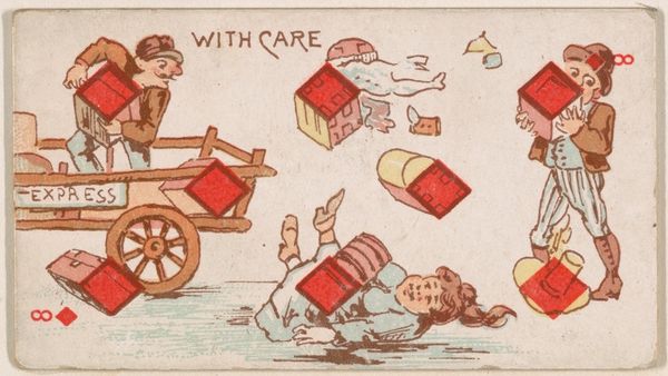 Editor: This is "Five of Diamonds, Vater-Land," a print drawing from 1889, by the Kinney Brothers Tobacco Company. The figure’s posture, straddling a barrel labeled “Lager”, is quite comical. What is your interpretation of its composition? Curator: Focusing purely on its form, notice the emphatic horizontality achieved through the figure's splayed limbs, creating a dynamic, yet stable composition. The use of contrasting colours – the muted blues and yellows against the sharp red diamonds – enhances the visual impact and creates balance, despite the absurdity. Editor: I see what you mean about the balance. Are those supposed to be horns on the figure's face? Curator: Indeed. Observe how these protuberances amplify the character's caricatured features. This highlights the print's intended humorous and perhaps critical tone without needing outside referents. Editor: So the elements work together formally to create meaning. Curator: Precisely. Consider also how the carefully arranged elements contribute to an overall sense of deliberate design and the balance between representational and purely graphic elements. The artist clearly aimed to control visual perception through composition. Editor: Interesting. The color palette does create that structure and makes this image quite amusing, regardless of any implied social commentary. Curator: Absolutely, our concentration on these visual characteristics sharpens our sensitivity to formal arrangement as an avenue for aesthetic and representational intent. Editor: I agree! Considering the formal relationships has made me see the artwork in a different light. Curator: Likewise, reflecting on the inherent structure reveals an intricate interplay between visual elements that shape how meaning may come through form.