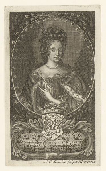 Editor: This engraving, "Portret van Theodore Gertrude de Kettler," dating from around 1645 to 1681, is currently held at the Rijksmuseum and was created by Edme de Boulonois. It gives a real sense of formality; she seems very aware of her status. What do you see in this piece, beyond just a portrait? Curator: The image carries the weight of societal expectations and the desire for enduring legacy. Her presence is framed by an oval, and behind her we see a window partially hidden behind a curtain with heavy folds: she is shown and hidden at the same time, a suggestion of modesty and perhaps vulnerability but also a display of richness and fabrics. Above the portrait we notice an armorial achievement, signifying her family lineage and social rank, and linking it with tradition and history. It gives us another layer into what symbols meant during that time. What do you think of the gaze? Editor: I see that now. The shield reinforces that idea of social standing and a sense of tradition. Her gaze feels almost confrontational, which contrasts with the lace and delicate details in her clothing. It’s like she is actively participating in how she is being presented. Curator: Exactly! The symbols are not merely decorative, but active participants in constructing her identity. Consider, too, the permanence implied by an engraving versus a painting. It implies the intention to project this image, her self-constructed identity, into the future. Do you see how the act of creating a print carries that deeper resonance? Editor: Absolutely, engraving solidifies the message! I hadn't thought about how the medium itself becomes part of the symbolism. Curator: It all works together, like the parts of a play coming together, doesn’t it? The texture, composition and her gaze were intentionally part of the language. We can continue decoding symbols if we look closer, but I find that looking at those elements offers great lessons about how people saw the world then. Editor: I’m glad we took a closer look at it beyond just a face on paper. Curator: Me too! I learned to look at symbols and engravings through a different perspective and connect them to a purpose.