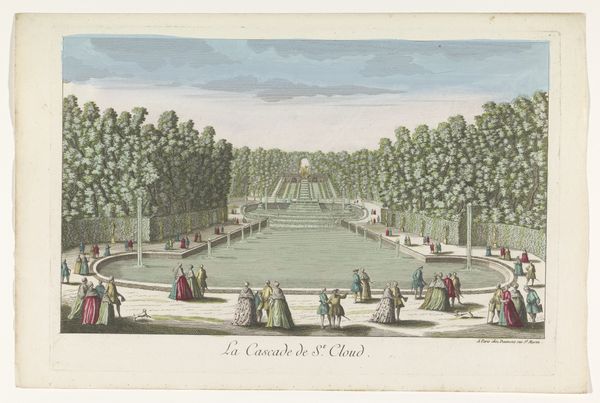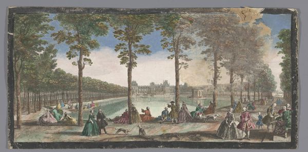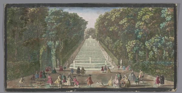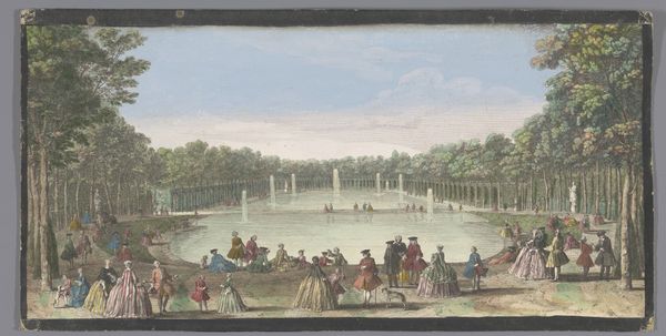 Curator: Here we have an 18th-century watercolor titled "Gezicht op het Grand Canal in de tuin van het Palais de Fontainebleau," held here at the Rijksmuseum. Editor: Oh, it's lovely! A very picturesque scene, quite dreamlike actually, with soft blues and greens that evoke a sense of tranquility. The figures seem almost doll-like. Curator: Indeed. Notice the very evident Rococo stylistic elements--the emphasis on leisure, the pastel palette. But think also of what a piece like this suggests about labor and class. Editor: True, the carefree scene definitely speaks of privilege and wealth. The rendering of clothing, in particular, reflects societal hierarchy and the luxury afforded by the upper classes. It seems as though leisure and play were part of an aristocratic aesthetic in this epoch. Curator: Exactly, and this "genre-painting" also subtly reveals the social order underpinning the Palace itself and the work required to build and maintain such an elaborate estate. You see that canal cutting through the garden’s design with this perfect geometry... Think of all the labor involved. Editor: It's striking how the geometric order, created in this vast landscape, is replicated by those repeating patterns in their clothing. Visually pleasing, sure, but the rigid, identical lines give this painting an uncanny, uncanny effect. Curator: But even within those strict forms, the use of watercolor creates a sense of transience, the fleeting quality of these perfect moments enjoyed at leisure by the upper class. And the very nature of watercolor – its fluidity, its reliance on light – all speaks to this moment in history. Editor: I see what you mean. In essence, the formal harmony of the piece conceals these layers of implied production. It leaves me to consider art's ability to shape, conceal, and unveil the truths behind class. It creates such a complex perspective. Curator: Precisely. Looking closer into the piece, and its function and material origin, shows this aestheticized image hides more about social dynamics than it readily admits. Editor: Well, by emphasizing these features, we start to question the reality of that image, to recognize that art doesn’t merely reflect but also interprets and even hides some truth. Thank you. Curator: You're very welcome! It's so important to remember that form and materials are always socially and politically constructed, revealing hidden labor behind appearances.