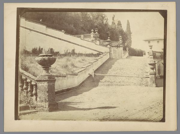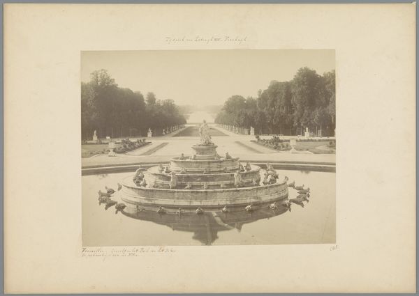 Editor: Here we have, captured through an albumen print somewhere around 1880 to 1900, J. Kühn’s "Parc de St. Cloud, La Grande Cascade", in Paris. It feels like stepping back into a dream, a staged wonderland. The rigid geometry of the cascades feels softened by the romance of decay somehow. What secrets do you think this watery landscape holds? Curator: Water, ah, water is the beginning and end, isn't it? For me, it’s a poignant reflection on grand ambition. Think of Versailles. Those monumental gestures aimed at immortality. This scene mirrors that human urge, yet softened by time. What do you notice about the light here, that pervasive sepia tone? It mutes the scene. And those tiny figures – dwarfed. Editor: They do seem almost afterthoughts! The whole scene feels… monumental, yet delicate at the same time. So it’s a reflection on human ambition and inevitable… softening, like time washing away sharp edges? Curator: Precisely! See how photography, still relatively fresh then, transforms a structured, engineered space into a moment, a whisper of an empire. Kühn offers a perspective, it is an exploration of beauty, a recognition of the transient in the supposedly permanent. Do you find it melancholic at all, or optimistic, maybe? Editor: Now that you point it out, there’s definitely a melancholy. But perhaps the people add a sense of continuation... They're living in this space and that brings me a little joy. Curator: Maybe Kühn sensed it too, that duality. He has, in the grand scheme of things, been gone a long time now but what they captured endures and touches us so. It’s lovely that you see joy, and I embrace it in its fragile loveliness! Editor: That makes the piece feel whole and complete to me, this dance between what's there and what fades. Thanks for the insight.