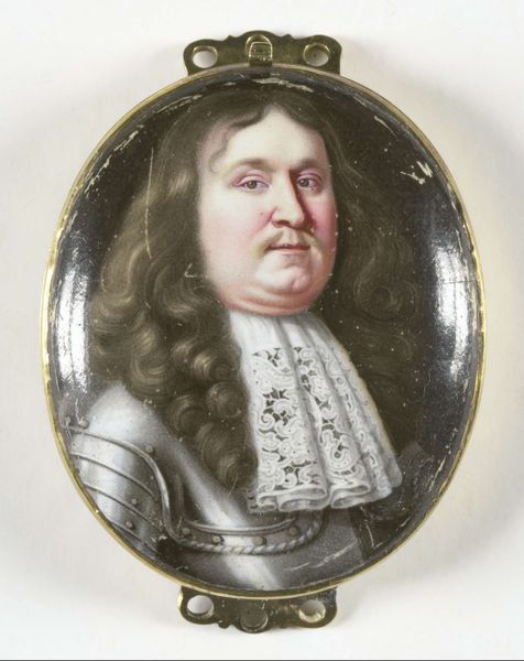 Curator: Welcome. Today, we're examining Pieter van der Werff's "Portrait of Willem Hartigsvelt, Director of the Rotterdam Chamber of the Dutch East India Company, elected 1657", likely completed between 1695 and 1722. Editor: The muted palette and rounded frame give the piece a sort of somber formality. It projects an air of mercantile severity. Curator: Quite. Consider that van der Werff was deeply engaged with the prevailing modes of production within Dutch society. Hartigsvelt, as a director within the VOC, the Dutch East India Company, wielded tremendous power and influenced global trade networks. Editor: Let's focus on the form, though. The stark contrast between the stark white collar and the heavy black robe anchors the composition. Note how the oval format contains, almost confines, the sitter’s presence. Curator: Yes, but this also hints at social constructs. That rigid, starched collar, for instance, both constrained and defined Hartigsvelt's public image, symbolizing status within the mercantile elite. Consider the wool trade, the bleaching agents used... the labour embedded. Editor: Perhaps, but I see something simpler at play. Van der Werff guides the eye. The light falls exquisitely on Hartigsvelt's face, pulling him forward while the background melts away. Curator: Light served practical functions in art creation and how it affected pigment properties... it's connected to available tools and the workshops available to the artist. We must remember that van der Werff didn’t have access to ready-made paints. Editor: True enough. There's a clear synthesis between visual representation and societal values at play here. Curator: And between material processes and the social structure of the time. Editor: Indeed. A complex layering of meaning and method captured on an oval. Curator: Precisely. A fine portrait that encapsulates its era's preoccupations, and a worthwhile subject of inquiry into history, the society of production, and much more.