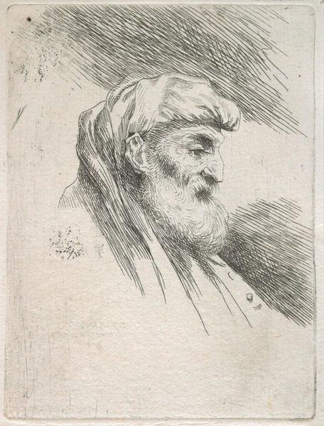 Giovanni Benedetto Castiglione, also known as Il Grechetto, created this print, "A bearded man wearing a tasseled headdress facing left," using etching techniques. The stark contrast between light and shadow immediately grabs your attention. A dense network of fine lines defines the form, giving texture to the beard and the ornate headdress, which dominates the composition. The subject's gaze is directed to the left, inviting viewers to imagine what lies beyond the frame. Castiglione's use of etching allows for incredible detail, while the lack of color focuses our attention on form and texture. We can interpret the contrast between the detailed rendering of the man and the more amorphous background as a metaphor for the tension between the individual and the world. This portrait invites us to consider the construction of identity through costume and representation. As we engage with the image, we become active participants in the ongoing dialogue between artist, artwork, and audience.