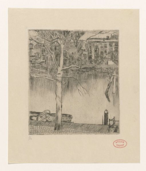 Léon Dolez created this etching of a canal with a tower in the background in the late 19th century. During this period, European art frequently turned to depictions of the landscape, often idealizing the relationship between nature and the burgeoning urban environments. Here, Dolez presents us with a tranquil scene, but it's worth considering how the canal itself—a human-made structure—shapes our understanding of the natural world. The canal facilitates trade and movement, reflecting the changing economic and social landscape of the time. The artist shows the canal as a mirror, reflecting the tower and trees, perhaps suggesting a desire to harmonize urban development with the existing environment. Canals often served as dividing lines, separating different social classes or districts, reflecting the inequalities inherent in the rapidly changing urban landscape. The emotional resonance of this image lies in its tranquil beauty, but it invites us to reflect on the complex relationship between progress, nature, and the social fabric of the time.
