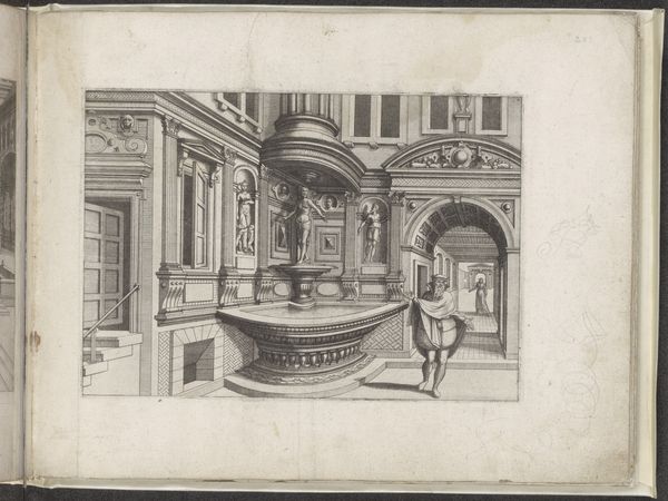 Curator: Immediately, I sense a very rigid, staged atmosphere, like a theater set waiting for a drama to unfold. The stark light emphasizes the strong geometry of the place, yet I am somehow not entirely sure where I'm at, but very much feel how everything is designed. Editor: Indeed. What we're looking at is entitled "View of a Church with Statues of Apollo and Melpomene". This engraving, dating back to 1601, is attributed to Johannes or Lucas van Doetechum. It's currently held here at the Rijksmuseum. Curator: Ah, yes! Apollo and Melpomene, god of music, poetry and dance alongside the muse of tragedy. That juxtaposition speaks volumes. They’re positioned almost as if guarding or embodying opposing aspects of the sacred space. Do you agree? Editor: I think what's particularly striking is the manipulation of perspective here. It appears to depict a grand architectural space, possibly inspired by Renaissance interpretations of classical structures, but ultimately, this feels more like an idea of a space than a representation of one. The very act of placing these Greco-Roman figures in this context hints at a humanist, early Baroque interpretation. Curator: Right. I find myself contemplating that seemingly endless recession of columns; they call to mind repeated symbols of past glory. There’s something very unsettling in the sheer repetition and order. It doesn’t inspire serenity for me. Perhaps the work's success in conveying this emotional paradox makes it interesting beyond just its historical depiction? Editor: Absolutely. It encapsulates the transition from Renaissance idealism toward a more complex, stylized vision, a trend echoed across early 17th-century Europe. What do you think this image conveyed at the time? It's something of a symbolic landscape... Curator: It may have offered both learned viewers and the common faithful a view of the ideal architectural setting - what values one hopes the institution embodies - in ways that a painted commission couldn't. By contrasting deities related to inspiration with a house of Christian worship, the image asks who belongs and how! I really like this subversion. Editor: On my side, considering the role of engravings in disseminating ideas and styles at the time, it might represent how emerging cultural tastes engaged with architectural theory in a tangible manner. It allowed broader participation and challenged contemporary standards in both design and religion. Curator: It does present an enduring reflection on the complexities of how tradition and modernity coexist within shared spaces. Thank you for sharing your own views! Editor: The pleasure was mine, and thank you for unraveling the many threads in this church setting.