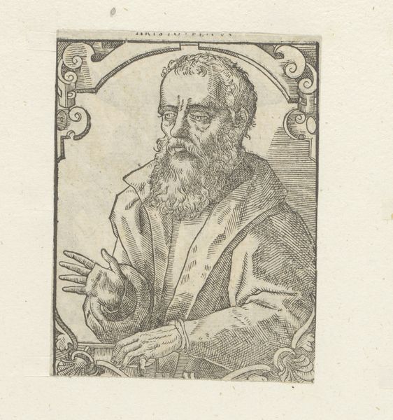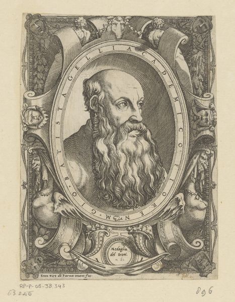 Editor: So this engraving, "Portret van een onbekende man," made sometime between 1549 and 1584, features an unidentified man framed by an ornate oval. I’m immediately drawn to his serious expression, the meticulous details of his beard, and how the cherubs frame the portrait. How do you interpret this work? Curator: This image is a fascinating study in symbolic representation and cultural memory. Observe the oval frame; consider it a "vesica piscis," a sacred almond shape symbolizing harmony. The unknown man stares back at us across time; is his expression weary, or contemplative? And who decided to frame him with cherubs? Editor: I see what you mean about the frame. The cherubs seem a bit out of place for such a solemn figure, like two different stories merged. Curator: Indeed. These juxtapositions are powerful clues. Cherubs often symbolized divine love and innocence; their presence could elevate this man, perhaps associating him with wisdom, piety, or even humanist ideals which would echo Classical associations. It seems as if the patron sought immortality through these very specific images. Editor: So it's less about capturing his likeness and more about embedding him in a visual language that speaks to deeper cultural values? Curator: Precisely! What appears a straightforward portrait transforms into a rich tapestry of cultural and psychological aspirations. Each element resonates with the echoes of Renaissance humanism and religious symbolism. By seeing his image memorialized like this, it shows he lived and had power and presence. Editor: That’s incredible. I had been too focused on just his face and missed how the surrounding imagery helps create and tell a deeper story. Curator: As we continue to consider imagery in art, be on the lookout for the messages transmitted by visual icons and their staying power.