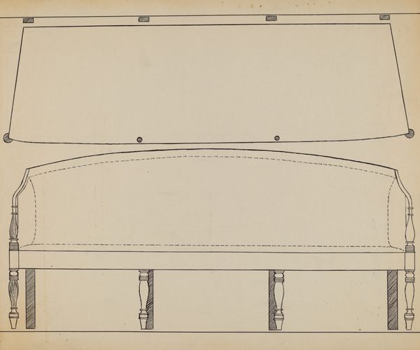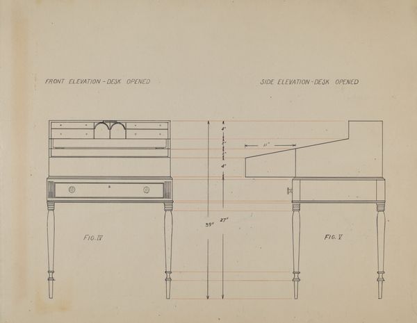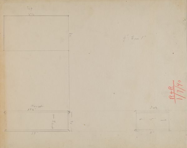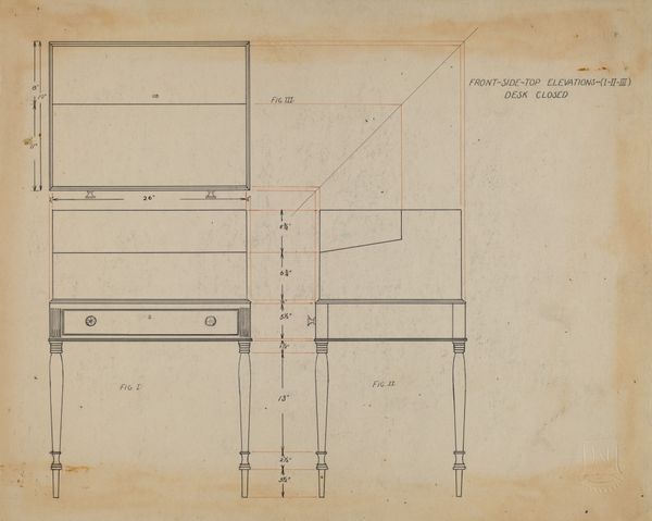 Editor: So this is "Table," a drawing on paper by Arthur Johnson, dated between 1935 and 1942. It's quite technical, showing different views of what looks like a tavern table. What historical context can you provide? Curator: Well, first it's crucial to understand that this isn’t just any drawing, it’s an architectural rendering displayed in a museum setting. Think about that shift. The drawing serves less as a functional plan, and more as an idealized representation of American history. Johnson's drawing memorializes and idealizes a colonial-era dining room, dating it to 1775. Editor: So it's about nostalgia as much as practical design? Curator: Precisely. During the Depression, the public craved reassurance and a connection to what they perceived as simpler times. Museums responded, but remember that presenting such images reinforces a selective history. Did this sanitization affect public perception of history, I wonder? Editor: Absolutely, I can see how only representing the dining room of a Danbury house presents a skewed view. Are the drawing's clean lines and precise measurements intentionally symbolic, too? Curator: They reinforce the perceived order and rationality of the past. By presenting an orderly design of early Americana Johnson offers a comforting and perhaps oversimplified view of America's colonial past, presented as self-evident fact, ready-made. Editor: I never thought about it that way before. It’s like the museum itself is making an argument through the image it chooses to preserve and display. Curator: Exactly. And by analyzing these choices, we reveal so much more than just the design of a table. Editor: I see now how something as simple as a drawing of a table can be so much more about history and culture. Curator: And also a powerful tool in shaping our collective memory. Food for thought!