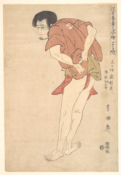 Editor: This striking image is titled *Masatsuya: Otani Oniji III as Ono Sadakuro*, a woodblock print created around 1794 by Utagawa Toyokuni I. The figure's exaggerated pose and features are instantly captivating. What strikes me most is the sharp contrast between the pale skin and the dark clothing, creating an almost theatrical drama. How do you read this piece? Curator: Precisely. We observe a deliberate use of line and form. The artist utilizes bold, unwavering lines to define the figure, thus creating a strong sense of presence. Note the angularity of the limbs juxtaposed with the curving lines of the garments. The interplay creates visual tension, directing the viewer's eye throughout the composition. Further, observe how negative space contributes to the figure's dynamic pose, enhancing its exaggerated and almost grotesque qualities. Editor: I see that now – how the angular lines accentuate the exaggeration, but what about the limited color palette? Is there something to decode there? Curator: Indeed. The restricted palette is crucial. The artist refrains from naturalistic representation, opting instead for select colors that enhance the visual impact. Consider how the strategic use of black serves to accentuate depth and contour. The choice allows specific features, like the face and hands, to draw primary attention. Could this be indicative of its caricature roots? Editor: That’s a perspective I hadn't fully considered before. I was so focused on the theatricality of the figure. Curator: This serves to highlight how careful formal analysis—a focused investigation of line, color, and composition—can lead us towards deeper interpretative possibilities, even without immediately concerning ourselves with external contextual information. Editor: That makes complete sense. I now appreciate how the intrinsic elements contribute to the artwork's expressive power beyond just its face-value imagery. Thanks for helping me look closer.