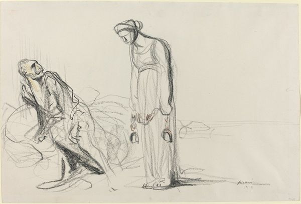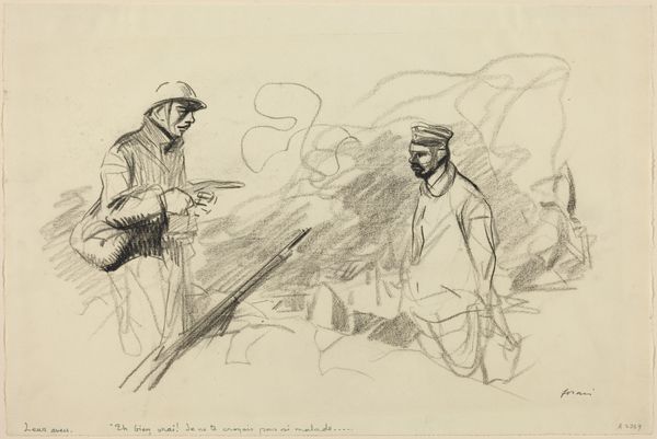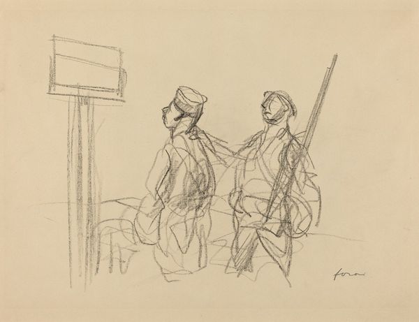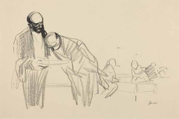 Curator: Looking at "Soldiers Preparing a Meal" by Jean-Louis Forain, likely created between 1914 and 1919, one can't help but notice the stark realism conveyed through a simple pencil drawing. It's a genre painting, offering a slice of life from the Great War. Editor: What strikes me is the utter fatigue in those figures, rendered with such delicate lines. The sketchiness, almost unfinished, adds to that sense of transience, of a moment snatched from the jaws of something enormous and awful. It's like seeing ghosts preparing supper. Curator: Precisely. Forain was deeply affected by World War I, and much of his later work, like this, directly engages with the human cost of the conflict. Notice the stark contrast in postures—the standing soldier seemingly watches over the others, their bodies communicating both weariness and quiet cooperation in a shared task. It's about capturing humanity amid mechanised horror. Editor: I am intrigued by how Forain hints at depth and texture using just pencil strokes, look how he renders the soldiers uniforms with just basic lines! The expressions are so evocative. One stares upwards as if anticipating something–a bombing?– while another prepares food. What a strangely intimate depiction of an ordinary task punctuated by dread. Curator: And context, of course, deepens our appreciation. Forain was working during a time when artistic styles were radically changing in response to technology and society's own evolution with industrialised warfare. So this pencil drawing becomes almost an act of preservation, of visually archiving humanity in crisis. Editor: Absolutely. It also feels like an observation, a quick capturing of lived reality by the artist. The fragility of the drawing embodies the fragility of existence for these soldiers. I also like how it leaves you feeling as if something huge is looming just outside of frame; one hears sounds just at the very periphery of what is represented visually. Curator: Reflecting upon Forain's "Soldiers Preparing a Meal," it's fascinating how such an unadorned medium could convey such complexity in the human experience during times of conflict, reminding us of the era's broader socio-political narrative. Editor: Agreed. The magic is in what it whispers: the terror, tedium and the shared human threads amid utter inhumanity, all rendered by the simplest of tools.