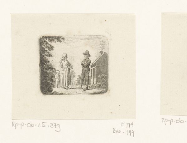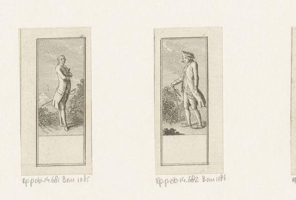 Curator: Here we have Daniel Nikolaus Chodowiecki's "Bescheidenheid," created in 1784. It’s an etching and engraving on paper, currently held in the Rijksmuseum collection. Editor: Oh, my goodness, they're so proper! A delicate balance between restraint and slight drama, you know? It almost feels like looking through a very civilized keyhole. Curator: The work falls squarely within Neoclassical aesthetics, a moment of renewed interest in the visual culture of classical antiquity, influencing everything from painting to architecture and, of course, printmaking. Considering the sociopolitical turmoil that marked this period, how does the theme of modesty, “Bescheidenheid,” speak to the issues of the day? Editor: Right? Modesty feels almost…radical. Look at these tiny figures. On the left, an introspective gentleman in a garden; and, to the right, a distinguished man and his very aristocratic dog...Is it a reflection, maybe a little dig, at the upper class? The very small scale demands an intimacy and scrutiny, the same kind one would have to take with someone hiding? Curator: These characterisations aren't about realism; they are vehicles for transmitting social and moral lessons through symbolism and allegory. The 'genre scene,' the dog, all reflect this need to express virtue. Consider that Chodowiecki used the print medium intentionally to broaden accessibility for middle-class consumption of such works, driving discussions about contemporary manners. Editor: See, that makes sense! To mass produce this little…whisper campaign. Curator: Exactly. His decision becomes almost subversive; making a seemingly gentle statement accessible to a growing literate public is a bold move, even in its restraint. Editor: Subversive modesty, I like it! Makes me want to go be politely defiant! So glad for the intricacies we found and those that are yet to find!