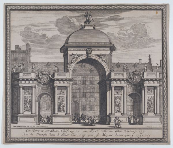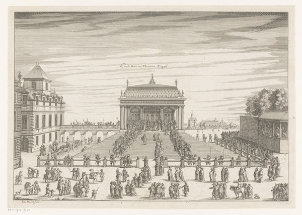 Curator: Here we have an etching by Stefano della Bella, created sometime between 1643 and 1653, titled "The Altar of the Holy Sacrament." The scene depicts a grand religious procession with Louis XIV and Anne of Austria. Editor: My first impression is the stark contrast between the rigid formality of the architecture and the supplication of the figures in the foreground. There’s a real sense of scale conveyed through the artist’s rendering of the crowd. You can almost feel the rough texture of the etching. Curator: Della Bella was a master of capturing the grandeur of Baroque court life. What's particularly fascinating here is how the etching medium itself became a tool of propaganda, disseminating images of royal power and piety across Europe. Notice how the tapestries featuring Raphael's artwork act to legitimize the lineage of sacred art traditions being displayed by the Royal Family. Editor: Absolutely, and let's not forget the labor involved. Consider the artisans who meticulously crafted the tapestries, whose craft is memorialized within this etching itself. Their skill and materials—the very stuff of their lives—is part of what we're witnessing. What kind of ink would have been used to create these? How were they transported and circulated in their own historical context? Curator: A pertinent observation! I believe the distribution of these etchings played a key role in shaping the public's perception of the French monarchy. These detailed visual records offer invaluable insights into the era’s social, political, and religious landscape, from artistic choices made for religious propaganda to those reinforcing court power. The strategic deployment of imagery and symbolism within the frame highlights the authority of both the church and the state. Editor: Indeed. This work feels very indicative of how art at the time often masked displays of consumption and domination through supposed acts of reverence, masking, in other words, the very material conditions of its production. Curator: Looking closer has helped reveal to me how the careful choreography in such art worked in conjunction with various socio-cultural institutions, constructing and promoting its messages to further the dominance of the monarchy and solidify faith at a volatile political time. Editor: Agreed; looking closely, in this context, reminds me that images are both aesthetic objects and material objects forged through social realities and labor.