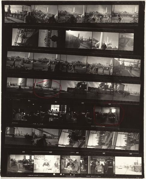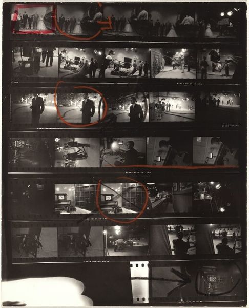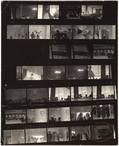 Curator: Immediately, I am struck by the high contrast and gritty feel of this contact sheet. It’s like a visual diary page, raw and unfiltered. Editor: Indeed. We're looking at a gelatin silver print from 1957 by Robert Frank, titled "Guggenheim 163/Americans 59—Washington, D.C." This work gives us insight into Frank’s journey across America as he documented ordinary life. Curator: The graininess enhances that "snapshot" aesthetic, which deviates so much from traditional studio portraiture of the time. It really underscores a sense of immediacy. How can that style shape what viewers were supposed to extract? Editor: His images offer a poignant commentary on post-war American society, exploring themes of inequality, alienation, and racial segregation. Here, the visible frame edges lend an almost journalistic quality, reminding us that we're seeing a fragment of a much larger story, where the artist as auteur intentionally captured that reality. Curator: Look at how figures are framed: some people huddling in dim locations, the interior of a crowded space that seems to be bursting from its very walls. There are definite narrative suggestions within each captured slice of reality. In terms of intersectional narratives, this sheet acts as a poignant collection of snapshots reflecting tensions felt, but rarely presented so straightforwardly. Editor: The deliberate sequencing in the sheet compels one to delve into its composition: it reveals a layering of narratives through juxtaposition. These aren't polished images intended for aesthetic pleasure; rather, they present an unvarnished vision shaped significantly by social critique. The formal properties such as tonality play a crucial role conveying the artist's message Curator: Right. It makes one consider representation not just visually but politically, offering commentary about which stories get told and from whose perspective. It is fascinating how what at first appeared as mere documentation evolves into a very intentional expression once one situates it in cultural discussions around those topics at that period of time. Editor: Ultimately, what distinguishes Frank's contribution rests significantly within those photographic nuances that carry significant historical reverberations regarding subjectivity through representation and abstraction concurrently with visual components carefully planned yet intuitively discovered while witnessing American actuality unfold.