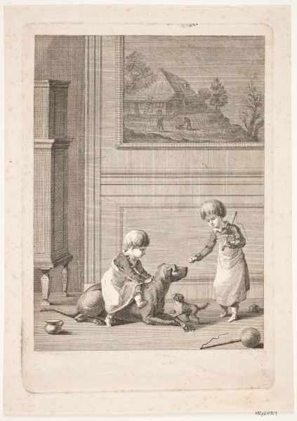 Editor: Here we have Jean Baptiste Guélard’s “Schoolmeester met leerlingen,” an engraving from the late 18th century. What a peculiar scene. The figures, all monkeys in human attire, evoke both humor and, I must admit, a slightly unsettling feeling. What do you see in this piece? Curator: I see a powerful commentary on the transmission of knowledge and societal roles. The artist employs monkeys, figures often associated with imitation, to represent the process of learning, inviting reflection. Consider how the image plays on the duality of appearances and substance. Editor: Duality? Curator: Yes. Monkeys mimicking human behavior. On one level, there's straightforward satire of the educational methods, particularly how rote learning may lack genuine understanding. But consider further, the act of the monkey-teacher with the whip signifies power dynamics... What traditions are being alluded to here, do you think? Editor: So it’s perhaps critiquing blind adherence to traditions or social hierarchies. I initially perceived it as merely whimsical, but now I'm beginning to see something much darker... more significant, socially. Curator: Precisely! And what of the monkey-pupil diligently studying? Where does he gain knowledge? Look at the composition, the weight placed upon him. He's almost like a "good student," quietly submissive... it makes you wonder whether such an environment of subjugation bears proper fruit. Editor: I never thought of it that way. So the monkeys aren't just stand-ins for people in general, but very specific representations within a system of education, or a system of power... Wow. Curator: Symbols carry layers of meaning. Editor: Indeed. This really makes you think about the relationship between appearance and reality and power structures. Curator: That’s right, and it goes to show how satire can be a powerful tool to comment on a very diverse number of cultural traditions.