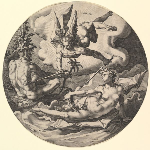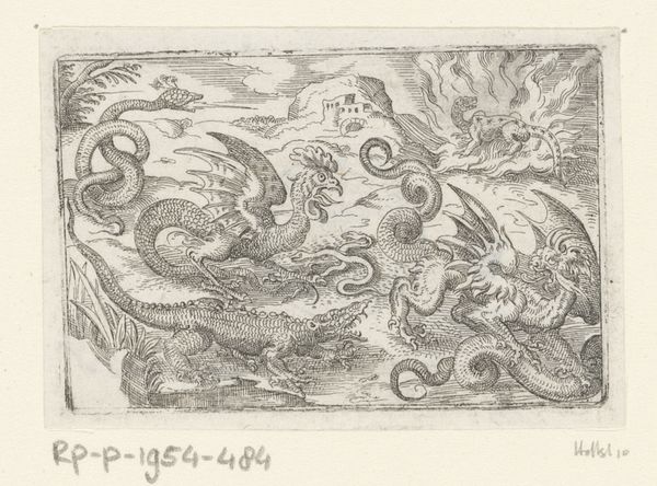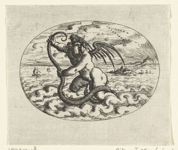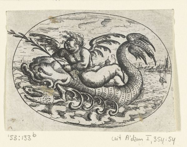 Editor: Here we have “Liggend ovaal met putto,” or "Lying Oval with Putto," an engraving by Christoph Jamnitzer, dating sometime between 1573 and 1610. It’s quite small, intricate, and somehow…whimsical. What strikes you about this image? Curator: I am struck by the fascinating juxtaposition of classical mythology and burgeoning Baroque aesthetics. What appears whimsical carries potent symbolism rooted in the visual language of power and divinity. The putto, derived from classical imagery, is often associated with innocence and love. But look closer. He’s riding a sea monster—a symbol of chaos and the untamed depths. Editor: So, it’s not just a cute cherub on a fantastic beast? Curator: Precisely. Think about what that sea monster *represents*. It speaks of navigating turbulent waters, mastering the chaotic forces of nature. Consider the oval frame. What does that signify to you? Editor: Well, an oval could represent an egg…new life, potential? Curator: Indeed. The oval, the putto, and the monster all co-exist. Jamnitzer is engaging in visual alchemy! A cultural memory and continuity are conjured through symbols, a dance of destruction and rebirth. And the ship in the background… a world opening to new possibilities? Editor: Wow, I hadn't considered it like that. I was so focused on the… the adorable strangeness of it all, that I overlooked its cultural weight. Curator: That's the magic of images. They can delight us on the surface, yet harbor layers of meaning that connect us to the past, influencing how we perceive the world. I wonder what a contemporary audience made of this image? Editor: Now I am wondering that too! It's amazing how much symbolism is packed into such a tiny image. Thanks for your insight.