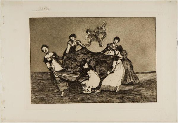 Curator: So, here we have Francisco Goya's etching, dating from between 1813 and 1820, entitled "Heavier Than a Dead Donkey." Editor: My first impression? A sinister playground. A macabre nursery rhyme. Those women, their expressions... and the men caught mid-air like grotesque puppets. Curator: The work belongs to Goya's "Disasters of War" series, but unlike the outright battlefield scenes, this one has a quieter, more insidious violence. The 'game' they're playing feels... performative. Editor: Exactly. It’s like a twisted ritual, isn't it? The women appear to be using a blanket to toss these men into the air, and the title implies some kind of crushing weight or disappointment. I'm immediately drawn to the gaze of the women—cool, detached. There’s a gendered power dynamic here. They seem both perpetrators and, somehow, victims of a social order. Curator: There’s certainly an element of performance, perhaps an unsettling commentary on societal complicity in the face of cruelty. Goya often used the grotesque to unmask hypocrisy. Think about who is truly in control and how ridiculous it all is! It’s as heavy as...well, you know! Editor: I see these bodies flung upwards, without agency or control. It speaks volumes about the vulnerable bodies impacted by war and systemic injustices. Consider, also, that "disasters of war" isn’t merely about literal battle. It implicates systems of power, and the many social tiers within it that are necessary for sustaining violence. Curator: He was never afraid to call it like it is! And don't forget the brilliant artistic craft at work, too! Editor: Indeed. "Heavier Than a Dead Donkey" provides a chilling reminder. As such, its art historical significance still resonates for us today!