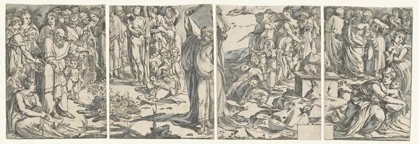 Editor: Here we have the "Hermit Saints Triptych," created around 1505 by Hieronymus Bosch, using oil paint on panel. The panels depict, well, hermits in rather surreal landscapes, with all sorts of strange goings-on around them. How do you even begin to unpack something like this? Curator: I think it's essential to focus on Bosch's choices regarding materials and production. Why oil on panel? What did that allow him to achieve? Look at the way he builds up layers of paint to create those unsettling textures. The materiality is inseparable from the message. This was not some divine spark; the labor here, the choices of pigment, ground, and support… they speak to a conscious artistic endeavor. Editor: That's a great point. I tend to get lost in the symbolism but thinking about the materials brings it down to earth. The oil paint would have been expensive, right? What does that tell us about who this was made *for*? Curator: Exactly! Patronage is paramount. And let's consider the panel itself. It’s a relatively portable object. Who would be commissioning and consuming this triptych? Where might it have been displayed and used? Was this ‘high art’ in the modern sense? Or did it have a different function within a domestic or devotional setting, blurring the line between art and craft object? Furthermore, what does its existence in a ducal collection now say about our changed social relationships with material things? Editor: It's interesting how grounding the analysis in materials actually opens up all these different avenues for interpretation about status and usage. I usually skip over that stuff. Curator: Material analysis invites these very sorts of socio-historical questions! How available and what was the price of oil, versus tempura? The work of the artisan is never neutral. The marketplace shapes what you see as much as Bosch's imagination. Editor: Okay, I am going to have to rethink my whole approach to Renaissance art now. Thanks! Curator: My pleasure. Always start with what’s in front of you. Then think about the hands that made it.