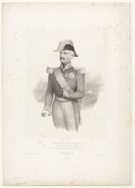 Curator: The artwork before us, housed here at the Rijksmuseum, is entitled "Costume of a Page of the Duke of Burgundy from the drama Louis XI à Péronne," created in 1826 by Louis Boulanger. It’s rendered in ink on paper. Editor: Stripes! That’s the first thing that hits you. A symphony of vertical lines vying for your attention—those striking black and white striped leggings immediately drag your eye downward and back up, don’t they? It’s so arresting; what a bold fashion statement, or rather, costume. Curator: Indeed, Boulanger captures not just a likeness, but also a reflection of societal structure, class distinctions inherent in theatrical representation and historical costume. Editor: It does feel like he's trapped, somehow. Despite the bright top and hat, it is melancholy. Maybe it’s knowing he is playing a role? Even though it is of some duke from history? I am curious. Curator: It’s worth noting the context. This work emerges during a time of fervent Romanticism, with an Academic underpinning, evidenced in the detail of rendering costume, and interest in genre and history painting. The choice of representing a theatrical figure connects to the era's fascination with drama and the spectacle of courtly life, all reflected on the stage. The way costume operates symbolically in historical context. Editor: You know, thinking about it as a study for a larger work unlocks it more. As if he were about to enter a big oil painting and his vertical prison is temporary. Thanks for shining a light on Boulanger, fascinating glimpse. Curator: My pleasure, art always encourages conversations.