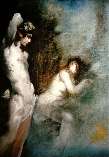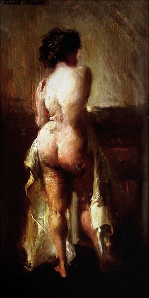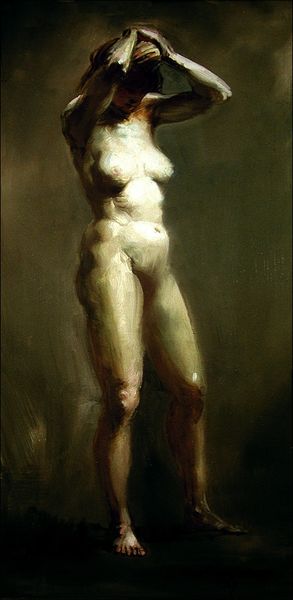 Curator: Frank Mason's oil on canvas, "Persephone," painted in 1964, presents a striking depiction of the mythical figure. Editor: Woah. First impression? Moody. Like stepping into a Caravaggio painting—all dramatic light and shadow, that intimate darkness! You can almost smell the earth...or maybe it’s just the turpentine. Curator: The Baroque influence is certainly palpable; we see it manifested through the tenebrism and the somewhat theatrical pose. However, I detect also notes of expressionism and romanticism in the brushwork and treatment of the subject matter. Look how the figure seems to emerge from and disappear into the surrounding darkness! The very definition of chiaroscuro. Editor: Precisely! It’s less a literal representation and more like Persephone, as an *idea*, struggling to be. And that gaze—a sort of sorrow mixed with…resilience? It’s less a captured likeness, more like an attempt to unveil a profound emotion or fleeting memory from within the artist. What do you reckon, Curator, is it the earth that’s imprisoning her or is she imprisoned by memory? Curator: Interesting. Semiotically speaking, her nudity signifies vulnerability, openness, yet is set against a composition filled with vertical lines, the figure rendered vertically from the dark crown to the obscure feet: it speaks to an emotional struggle, perhaps an entrapment implied by both the mythical narrative and, simultaneously, Mason’s construction. We may infer some parallels between these interpretations and our own existence? Editor: Absolutely! It begs the viewer to contemplate our own cyclical descents and ascents, you know? It is an artwork not just for art's sake, it is for humanity. Gosh! it's that universality that makes "Persephone" resonate across decades. Like looking into a mirror of shared human experience…albeit a very artsy, Renaissance-style mirror. Curator: Indeed, it remains a fascinating exploration of form, shadow and light that allows many views, across time. Thank you! Editor: It has been such a pleasure; truly.
