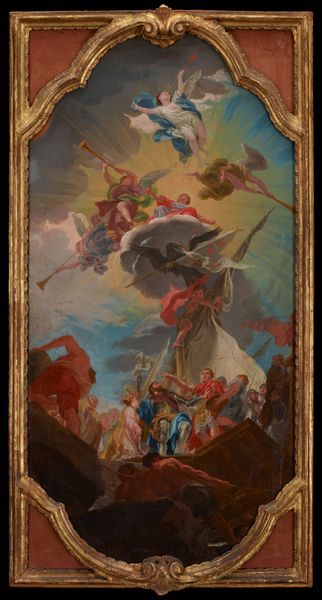 Editor: So this is Gaulli's *Madonna in Glory Crushing the Snake*, an oil painting. The dark background and radiant figure really create a sense of drama and triumph. What strikes you most about this piece? Curator: I'm immediately drawn to the iconography. Consider the historical context: imagery like this wasn’t just about religious devotion, it was deeply intertwined with power. The Virgin Mary, bathed in divine light, literally crushing a serpent – that's a potent visual message, particularly resonant in the Baroque era, when the Church sought to reassert its authority through art. Editor: It does feel very intentional, the way it’s staged. Curator: Exactly. It begs the question: who was the intended audience? Was it primarily for a religious order, a noble family, or for wider public display? That informs how we interpret its meaning and impact. Think about the message this sends about women. Editor: It presents an interesting paradox. Submissive yet powerful. Curator: Precisely. The depiction of the Virgin as both ascendant and dominant speaks volumes about the complex role women occupied within society and the religious imagination during the period. Do you agree that this is an empowering depiction? Editor: That's such a great point. I'll never be able to look at this the same way again. Curator: These discussions encourage us to see art not as isolated objects, but as products and reflections of the society from which they came. I think that examining how visual cues influenced both faith and secular power makes this artwork unforgettable.
