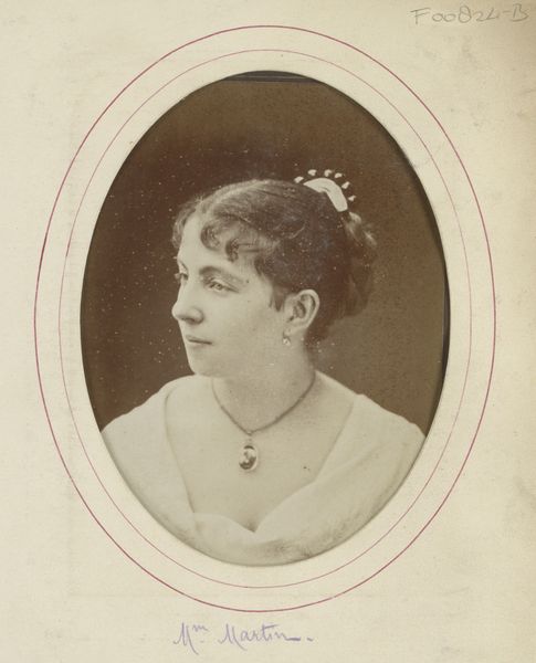 Curator: This print, showcasing Ada Russell, belongs to the "Actresses" series created around 1890 by Kinney Brothers, known for promoting Sweet Caporal Cigarettes. It’s part of a larger history of promotional imagery featuring women in popular culture. Editor: The image has an undeniably wistful air, a very soft sepia tone adding to this old fashioned sentiment, even through it's made for commercial consumption. The lace detailing feels quite intimate. Curator: Indeed. These cards were produced during a boom in tobacco consumption and an era when advertising actively constructed celebrity personas, particularly for actresses. There’s a tension here: celebrating women while simultaneously marketing a harmful product. The composition with her gaze angled off toward the left hints at influences of Japonisme. Editor: Precisely! These trade cards placed actresses within reach, almost like a paper friendship. They played on ideas of fame, feminine beauty and commodification, all neatly packaged for male consumption. What strikes me is how seemingly benign images can perpetuate limiting ideas around celebrity and public persona. Curator: Exactly. The format of this print itself reflects evolving social attitudes toward actresses – moving them from stage performances to accessible and collectible commodities. Examining the social networks propped up by marketing such as this gives insight into the politics of representation at this time. Editor: Looking at it now, over a century later, it also underscores how deeply embedded marketing imagery is in our visual language. Ada Russell here isn't just a photograph of a woman. She’s part of a network connecting beauty ideals, commercial practices and evolving perceptions of female identity within the social milieu. Curator: This small print is, as you put it, a nexus of many threads – a testament to the complex role imagery plays in shaping both our understanding and our marketing strategies. Editor: A somewhat innocent-looking card, certainly, that on closer inspection challenges what we consider innocuous images of beauty and representation to actually reveal.
