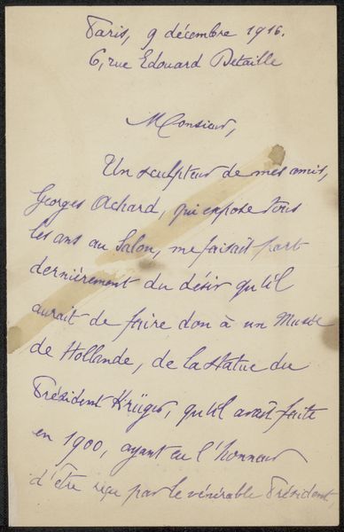 Curator: This is "Brief aan Philip Zilcken," a letter possibly dating from between 1920 and 1927, rendered in ink on paper. Editor: The looping script has an almost hypnotic feel, though I confess I can’t decipher a word of it. It exudes an era of elegance, and lost intimacy of correspondence. Curator: Well, even if you can’t read the language, consider that written correspondence can become deeply politicized, imbued with the nuances of power dynamics and cultural expectations of its time. This piece, regardless of the writer's intent, engages in those historical realities. Editor: And within that script, the careful formations of each word tell me stories about its writer. Do you notice the exaggerated ascenders and descenders? Almost calligraphic. It makes me think of someone carefully curating an image of themselves through penmanship. It feels incredibly intentional. Curator: Certainly, the act of writing itself has long been a contested space for various identity groups. Think of the historical exclusion of women from literacy, or the forced assimilation through language. Each careful stroke potentially carries a trace of that tension. Editor: Absolutely, I notice the date at the top, which is interesting, suggesting an epistolary connection between individuals. There is something so tangible, too, about the materiality of the ink and paper itself, surviving decades. What were the emotional undercurrents behind those neatly arranged sentences, penned during such a turbulent era? Curator: Those are invaluable questions to keep in mind as we think about whose stories get amplified through the historical record, and whose voices remain on the periphery. This piece can push us to contemplate the hidden dialogues of its era. Editor: Exactly. Thinking about the layered meanings behind such a simple-seeming document only deepens its power.