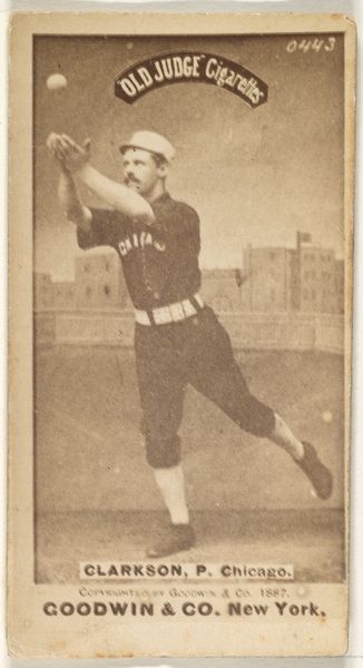 Curator: It's extraordinary how much social history can be gleaned from what was, ostensibly, an advertisement. Editor: Absolutely, this photographic print, dating back to 1887, presents T.C. Burns, the third baseman for Chicago, in a portrait taken by Goodwin & Company for the Old Judge Cigarettes series. My initial impression is its sepia tone evokes nostalgia, yet it also projects a determined spirit, almost a quiet heroism. Curator: Nostalgia definitely plays a key role. These baseball cards, inserted in cigarette packs, acted as cultural currency. They helped to construct the image of the baseball player as an aspirational figure and were avidly collected by people of all social classes, connecting them to a larger cultural narrative around sports and leisure. Editor: The soft-focus background and deliberate pose—bat raised, gaze focused—reminds me of classic portraits. The 'Chicago' emblazoned across his chest serves as an icon. This card offered fans something tangible, a symbol representing their team and the city’s pride. How significant the name 'Old Judge', suggesting authority and reliability at a time when cigarettes' harm wasn't common knowledge. Curator: Right, and the fact that baseball imagery was used specifically suggests a strategic targeting of a male audience, associating their product with vigor and healthy competition—despite the health consequences of smoking! What this baseball card is doing is mythmaking on a grand scale: associating the mundane act of smoking with a romantic vision of athleticism and hometown pride. Editor: What I find poignant is the convergence of commerce, identity, and sport embodied in a small cardboard. It reflects the changing social landscape of late 19th-century America, its evolving ideas surrounding fame, leisure, and even personal well-being. Curator: Yes, beyond just sports memorabilia, we see visualized societal aspirations. Studying popular iconography like this is like unlocking the collective dreams—and contradictions—of an era. It offers vital material to help understand our cultural memory. Editor: An artifact of image circulation, aspiration, and identity creation all in a conveniently sized package. Something to remember.