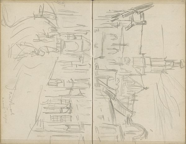 George Hendrik Breitner sketched "Gezicht in Amsterdam, mogelijk het Rokin" in pencil on paper, and the stark, linear composition captures a moment in Amsterdam with raw immediacy. The sketch is divided, with the left side a flurry of architectural details and the right side showing the heavy form of a canal barge or loading dock. Breitner’s sketch presents us with a study in contrasts—the static versus the dynamic, the man-made versus the natural. Notice how the artist uses line to define form and space, capturing the industrial activity along the canal. The sketch is more than a mere depiction; it's a structural investigation into how different forms interact within a shared space. The sketch invites us to consider the interplay between urban development and the natural flow of life within the city. It's a reminder that art, even in its most nascent form, engages with and interprets the world around us.
