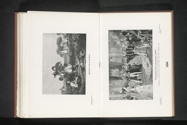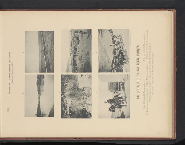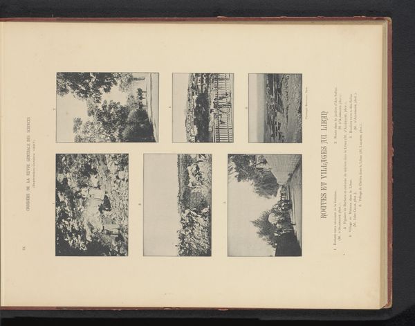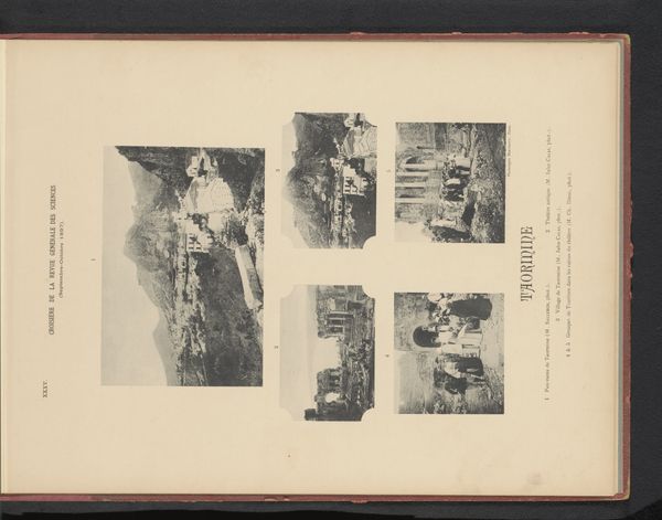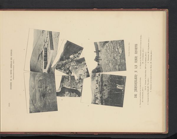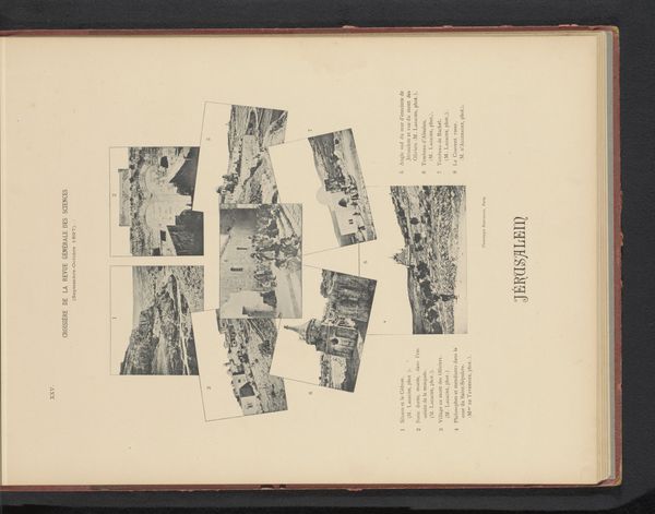 Curator: The overall feeling is rather subdued, wouldn't you agree? Almost sepia-toned, a world captured in a bygone era, like faded memories clinging to the page. Editor: Indeed. What we have here is a collection entitled "Zeven gezichten op Jeruzalem, Israël" or "Seven Views of Jerusalem, Israel", dating from before 1898. It is made with the albumen print technique which explains that unique colour, a process prevalent during the rise of photography. But there is more than just the views, the page has typography, framing each image which are scattered around. This placement suggests a careful consideration for layout within a larger publication. Curator: The layout almost gives it a scrapbook feel. The font itself, it looks so antiquated yet dignified, a real testament to the historical perception of Jerusalem and its portrayal through typography of the time. The typography and photographs are working together, yet also clashing to convey something unique and perhaps deeper than expected. Editor: That is so. And look closely: We see glimpses of daily life, bustling streets perhaps or sacred walls. The symbols are muted yet evocative – the textures, even in monochrome, speak volumes about this holy place. The architectural details point to its multilayered religious history and contested history as well. It invites interpretation. Curator: There’s a profound emotional quality about this work, even through the mechanical reproduction. One can't deny Jerusalem has had deep resonance as the "Holy City". Its importance as a melting pot is only reinforced by these visual fragments and the different historical elements shown here. Its past is literally layered, if you think of those different religious quarters we see here. Editor: Absolutely. It serves as a visual artifact. It is indicative of broader trends in 19th-century Orientalist art. We begin to grasp how places are represented. Images of the “Holy Land”, then mass-produced for consumption and distributed to viewers far removed from the region itself. Curator: The work certainly provides us with windows into a complex, multilayered relationship to faith, history and representation, I will ponder on this piece a bit more later on. Editor: Yes, it urges us to critically reflect on how imagery shapes perception.