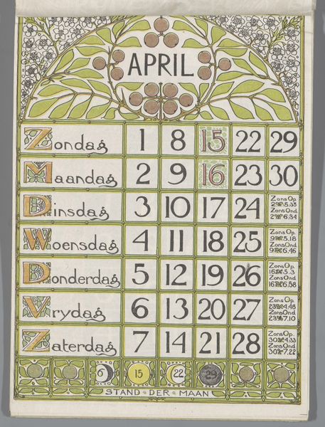 Curator: Ah, "Kalenderblad augustus 1900" by Theo Nieuwenhuis, created in 1900. It’s currently held at the Rijksmuseum. Made using drawing and poster methods during the Art Nouveau period, so its historical and cultural weight are immediately present. What is your immediate reaction, looking at this calendar? Editor: Utterly charming, isn’t it? It has a kind of faded elegance, a whiff of a summer garden party held a century ago. All the floral motifs give a lightness. Though at the same time, the linear structure of the grid brings to mind architectural design. Curator: That’s a keen observation. The blending of natural, organic forms, like those daisies, with geometric elements indeed reflects the Art Nouveau aesthetic—a bridge between the old and the new, perhaps. Look at how Nieuwenhuis stylizes the text; each letter contains a new visual flourish. Editor: Absolutely, there is a visual tension happening here. There’s this almost…naive rendering paired with very controlled patterns, like fabric designs, suggesting both artistic freedom and disciplined execution. But, there's more at play with symbolic weight. Do you agree? Curator: I do. Notice the deliberate inclusion of moon phases and sunrise/sunset times, and of course, a pattern around each title for each day of the week. They aren’t just decorative; they serve as a mnemonic, grounding the viewer in the rhythms of nature. Consider this artwork's function, as a calendar meant to give someone a sense of control over a week or month. Perhaps nature's design is trying to nudge someone to go outside? Editor: Or to control one's summer vacation! There's so much design jammed in each tile that it feels bursting with ideas about the future! What the owner of this design, what that owner's summer may hold, perhaps? It's a lot of weight! Curator: Well, I’m seeing cycles of culture intersecting nature. Very thought provoking! Editor: Very! Well, time to plant some daisies, I guess! Thanks for showing this lovely image.