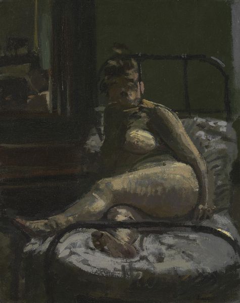Adolf Hölzel made this painting, Liegender Halbakt, with what looks like oil paint, and maybe a palette knife going by those thick impasto marks. It's all about how those materials get pushed around, right? Check out the area just above the bed on the right, see how the paint has this chunky, creamy quality? It's not trying to hide anything, it's all about the surface, the physicality of the medium. And look at the different blues, browns and greens. These aren't blended perfectly; they’re kind of fighting each other for space. It’s like Hölzel is letting us see his process, not giving us a smooth illusion, but showing us the bumps and the starts and stops. I feel like there's a conversation happening with someone like Courbet, but with Hölzel, it's less about the ideal nude and more about the act of painting itself. The painting isn't presenting some smooth surface, it’s embracing its own messiness.