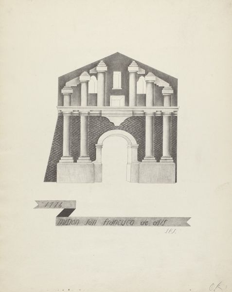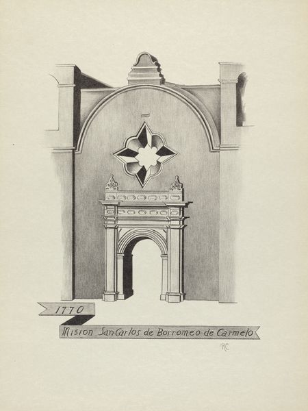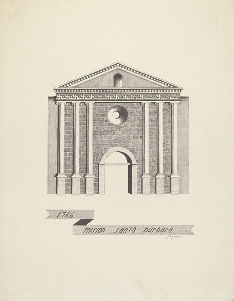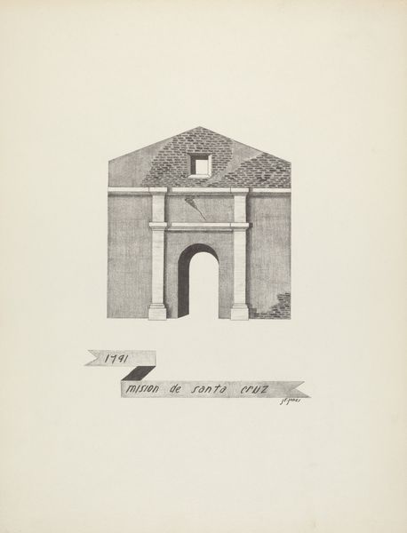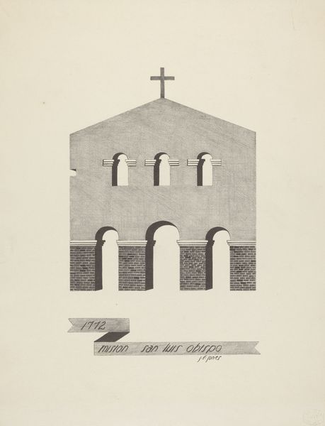 Curator: I am immediately drawn to the somber elegance, it feels very still and monumental. Editor: And precise! We are looking at James Jones' "Mision San Juan Bautista," a pencil drawing rendered sometime between 1935 and 1942. The texture feels smooth, like he took his time building up the tones carefully. Curator: Yes, you notice the texture. I am struck by how even in its simplicity, the drawing evokes the gravitas of faith and enduring history. It projects a rather formidable image despite its limited range of values. Editor: The pencil work allows Jones to document with an immediacy of seeing, capturing every surface variation. He pays great attention to detail; the shadows give it three dimensionality while maintaining a clean aesthetic. It also prompts reflection on access to labor during that era in the San Antonio region where Jones was active. What does such an unadorned facade signify about the materials or available resources at hand during this specific historical juncture? Curator: A lack of adornment can represent diverse conditions, the artist choosing simplicity or the maker working with paucity, either way creating images with significant emotional weight. The mission architecture, reduced to its core geometric shapes, channels a kind of spiritual resilience – as if saying "I remain." The window, set back into the structure, beckons questions about perspective and history; it is the only break from this somber mood, the singular feature of its facade. Editor: It is a controlled hand! A quiet homage paid to material existence; Jones prompts us to appreciate these historical structures through their tactile details while understanding broader narratives about place making involving laboring populations during his lifetime. How did craft techniques evolve or disintegrate within modern social settings during the period represented within and without artwork creation here? Curator: That interplay between surface and history intrigues me. He seems intent on representing the visual experience of history, rather than a nostalgic reenactment. This singular pencil work becomes a vessel for remembrance. Editor: A meditation on process through architectural image and graphite, revealing hidden contexts embedded in production histories--beautiful observation. Curator: Agreed. A stoic echo captured through focused hand, truly making Mision San Juan Bautista become memorable across lifetimes.