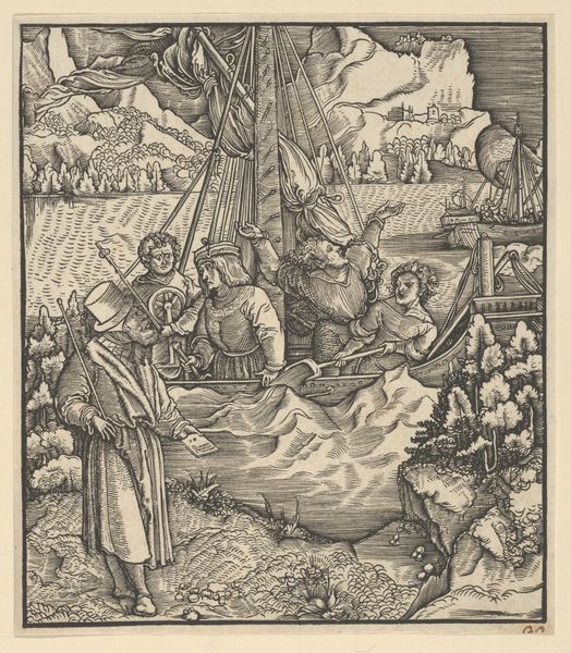 Editor: We're looking at Albrecht Durer's "The Schoolmaster," a pen, ink, and woodcut piece from 1510. I’m struck by the contrast between the detailed figures in the foreground and the more abstracted landscape behind. What's your take on this, from a historical perspective? Curator: Durer was deeply interested in representing the world around him, but his work was also very much informed by the socio-political environment. Consider the rising literacy rates at the time and the shift in power from the church to secular institutions. How do you think this piece might be engaging with those societal changes? Editor: Well, you've got the schoolmaster as the central figure, rather than, say, a religious icon, so maybe it's saying something about the growing importance of education and humanism? Curator: Precisely! And consider the visual construction: Durer is placing the figure of the teacher in a formal composition. The institution of learning itself is being elevated to a point of social and political prominence. And the use of print – making it accessible to a wider audience – speaks volumes about the democratization of knowledge. Do you find any hints of criticism or satire here? Editor: Perhaps in the teacher’s rather severe expression? Maybe Durer's commenting on the potentially stifling aspects of formal education. Curator: Indeed! By embedding the school scene within this organized landscape and contrasting his figure's expressions, Durer subtly critiques this emerging institution. The 'schoolmaster' becomes a mirror reflecting shifting cultural values. Editor: That makes me see it differently! I was so focused on the artistic skill, but now I realize how much it says about society at the time. Curator: Absolutely! Art isn’t just about aesthetics; it's a historical document reflecting the dynamic interplay between power, knowledge, and society.