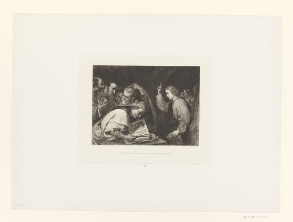 Curator: Here we have "Pietà," an engraving on paper created sometime between 1835 and 1899 by Johann Leonhard Raab. Editor: My first impression is the weight. The figures are heavy with grief, especially the posture of Mary holding Jesus. It has this classical, Renaissance feel. Curator: Indeed. This print captures a scene brimming with historical and artistic symbolism. Raab skillfully renders the textures of the drapery and the expressions of sorrow etched on each face. We can discern an almost palpable sense of loss. Editor: Yes, the specific poses communicate deep religious meaning. We see the echo of Michelangelo’s famous sculpture. The image of the grieving Madonna and her son serves as a poignant reminder of faith, sacrifice, and ultimate redemption across multiple eras and cultures. The halo above their heads reinforces the iconographic element. Curator: Beyond its symbolism, what intrigues me is how Raab, working with the rigid process of engraving, manages to convey the raw emotion inherent in this scene. The material constraints of the printmaking process highlight Raab’s artistry, challenging assumptions of mere reproduction. And by the way it mimics stone carving it calls back to materiality as well. Editor: Right, look at the cave or tomb. The heavy line work almost makes it a character in itself! The darkness surrounding them highlights the sense of isolation, amplifying the human drama. Each element has a story to tell that stretches across history. Curator: It is interesting to think of who created the original. As an engraving the artwork creates questions about reproduction. Also I feel like this would have brought mass production to this classic form, that at one point was exclusively made out of stone. Editor: It's amazing how one can engage with timeless motifs through such material iterations. Each detail reflects complex histories of artistic expression, enduring cultural narratives, and raw emotionality. Curator: I concur. Reflecting on the materials used and the process, what started as simple prints ended up serving a crucial role in disseminating cultural values through artistic expression and mass consumption.