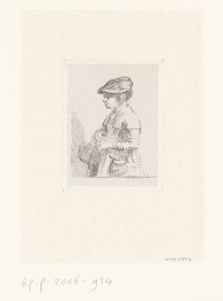Editor: Here we have Antoine Alphée Piaud’s “Old Woman Sleeping,” an etching from 1859. I find it very poignant; she seems to embody exhaustion and maybe even a quiet resistance. What's your interpretation of the piece? Curator: Considering the historical context, it’s less about personal emotion and more about social observation. Genre paintings and portraits like these often served as records of a society's understanding, even idealization, of certain classes and roles. The “Old Woman Sleeping” captures an individual, but it also tells a story of aging and potentially, the role of women and the poor in 19th century French society. Editor: That's interesting! So you're saying it's not just a simple depiction of sleep, but something more? Curator: Precisely. Etchings and prints democratized art, making it more accessible. So, think about the intended audience and what the artist might be trying to say to them. Is this image intended to evoke pity, respect, or something else? How do her clothes, the book under her arm, inform our understanding? Editor: The fur hat does look pretty fancy, a sharp contrast to her worn face. I'd assumed poverty, but the fur seems contradictory. Maybe Piaud is aiming for a complex portrayal? Curator: The contradiction might be the very point. Consider the debates surrounding poverty and social welfare at that time. Realist artists were keen to represent society as it was, complex and unflinching, thereby inciting the middle class to reflect on wealth distribution. What role might galleries play in showcasing works like these? Editor: So, maybe this print challenged the viewer's perception, leading them to question their own place in the social order. Thank you, I’ve never considered the role of political undertones of something as "simple" as this scene. Curator: Precisely, understanding how art is presented, consumed, and debated within a society opens a far richer understanding of art history.