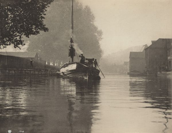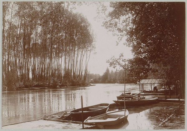 Curator: Looking at this gelatin silver print, the light and shadow give it such a strong, evocative quality. Editor: There’s a stark stillness to this image, despite the implied movement of the water. Almost like a staged tableau, very formal. Curator: It's a photograph entitled "Theodoor Brouwers en arbeiders bij sluis op plantage Accaribo te Suriname," created sometime between 1916 and 1930. Brouwers documented labor and landscapes in Suriname, giving us insight into its social fabric. Editor: So, this is a slice of life under Dutch colonial rule, quite literally captured with the chemical processes of the era. Look at the varying tones achieved in the water’s surface. Was it locally sourced material for developing the photographic paper? Curator: Indeed. And note the placement of the figures – some perched above, others in boats – subtly emphasizes the existing hierarchy, drawing attention to the laborers' roles. This imagery reinforced racial and labor politics. Editor: It does, it exposes a division based on who's directing labor and who is performing it. Even their clothing signifies their roles. I'm curious about the process; about the development, the darkroom techniques used to realize this scene... the implicit labour involved. Curator: Precisely, and consider how genre painting aesthetics intersect with the colonial gaze to legitimize and romanticize the existing societal imbalances of Suriname during that time. Editor: Right. It is a colonial lens – seeing Suriname and its resources from a decidedly European, commercial perspective, almost certainly intended for distribution, display, consumption in Europe. Curator: Yes, exactly. What initially seems a straightforward snapshot speaks to deeper political and social dynamics, challenging us to rethink notions of progress and justice. Editor: It definitely does, revealing not only the colonial context but the colonial photographic industry as a machine. Curator: A single photograph really encapsulating layers upon layers of complex social systems and production relationships. Editor: Absolutely, that interaction really makes you consider the tangible impacts of colonialism.