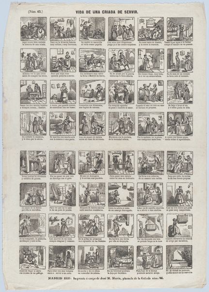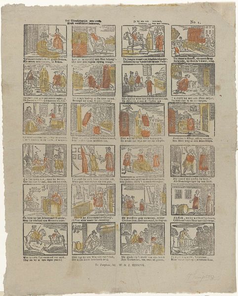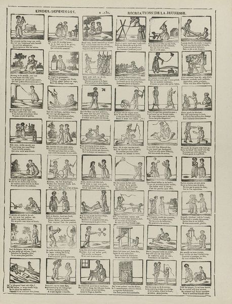 This hand-colored etching was created by Hermanus Numan in the late 18th or early 19th century in Amsterdam. The print, whose title translates to "Look here, children, yet something new, if it can please you," offers a glimpse into the visual culture of the Dutch Republic. The print presents a series of small, narrative scenes, each accompanied by a short verse. These scenes capture daily life, offering a window into the era's social customs, clothing, and interactions. This work reflects the culture of the period, as well as its forms of entertainment and education. The small scenes depict moments of work, play, and social exchange that reflect the hierarchical structures of the time. They also give glimpses into the lives of children and the roles they were expected to play. This work serves as a reminder of the complex ways in which art can reflect and shape societal values, offering a nuanced understanding of both its emotional and cultural dimensions.