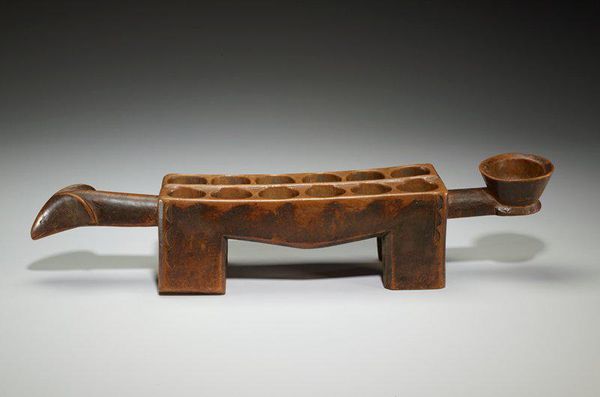 Curator: Ah, here we have an intriguing example of indigenous art: a wooden bird headdress, believed to have been crafted sometime between the 19th and early 20th centuries. Its creator remains anonymous, adding to its mystique. Editor: Mystique is right! I'm immediately struck by the contrast of textures—the smooth, almost mournful curve of the neck, against the carved detail of the wing. There's a real sense of quiet dignity here. Curator: Indeed. As a carved wooden relief sculpture, the headdress occupies a unique space. While its specific origins and the society for which it was created are not explicitly detailed, such pieces often carried profound social and spiritual significance. They were frequently employed in ceremonial contexts. Editor: You know, seeing how the wood has aged and the paint has faded, it feels almost like a memory solidified. Like it's holding stories from countless ceremonies, from dances and rituals we can only imagine. I get this tangible feeling of connection to something ancient. Curator: It's a poignant observation. The carving style, the very deliberate nature of the rendering, points to a sophisticated understanding of avian anatomy translated through the lens of cultural symbolism. These headdresses were rarely mere decoration; they were powerful symbols of status, spiritual connection, and community identity. Editor: And that eye... It’s almost a void, but there’s so much depth. It invites you to project onto it. What does the bird see? What has it witnessed? It makes you wonder about the weight of the traditions it embodies, you know? It isn't simply an artifact; it is a vessel of experience. Curator: Precisely. Analyzing it now within a museum context encourages conversations about how we present and interpret such cultural objects, as well as consider the complex history of their collection and display. Its presence encourages contemplation. Editor: For me, it's a reminder that art can be a bridge across time, whispering secrets about people we'll never meet and beliefs we can only try to understand. Curator: Absolutely. And perhaps in that attempt, we better understand ourselves, as well. Editor: I'll second that. Thanks to this bird and those who have protected it across time for bringing those stories to light once more.