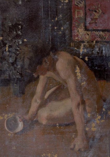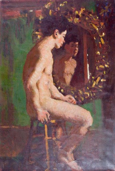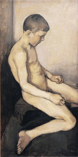 Curator: This is Denman Waldo Ross's painting, "Profile Portrait of a Seated Young Man," housed here at the Harvard Art Museums. Editor: It strikes me as vulnerable. The muted tones and downward gaze create a sense of introspection. Curator: The figure's averted gaze could symbolize humility, or perhaps a detachment from the viewer's expectations. The lack of specific dating also speaks volumes; it resists being pinned down to a particular moment. Editor: And that ambiguity allows for broader cultural readings, doesn't it? Nudes in art have historically been laden with symbolism, often tied to ideals of beauty, power, or morality. Curator: Precisely. The lack of classical idealization is also interesting. It invites us to consider more personal, perhaps even psychological interpretations. Editor: It's as if Ross wanted to capture a fleeting moment of humanity, stripped bare of artifice. I find it quite moving. Curator: A subtle commentary on the human condition then, beyond any specific historical context. Editor: Indeed. A quiet moment for reflection, then.