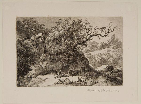 Editor: Here we have Ferdinand Kobell's "Two Travellers Resting by the Road". It's a print, quite small, and depicts a wooded landscape. I’m struck by how romantic it feels. What stands out to you? Curator: Well, consider the historical context. Late 18th century. Who are these travellers, really? Are they romantic figures, or perhaps displaced people? The landscape isn't just a backdrop; it's a commentary on social mobility and the realities of travel for many at that time. Editor: That's a perspective I hadn't considered. I was focusing on the aesthetic. Curator: Art isn't created in a vacuum. Look at the way the trees are drawn, almost like protective figures. Kobell may be asking: who is afforded safety and rest, and who is denied it? Editor: So, it's not just a pretty picture, it's a statement about society. I'll definitely look at art with a more critical eye from now on. Curator: Precisely. Art challenges us to confront uncomfortable truths and consider whose stories are being told.