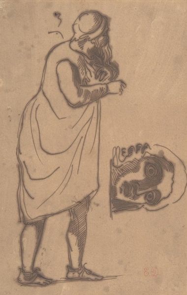 Editor: Here we have Paul Klee's "An Allegory of Propaganda," created in 1939 using watercolour and possibly oil pastel. I find this portrait incredibly delicate, almost ethereal, with that wash of golden yellow. How do you read it? Curator: Delicate, yes, but I also see a quiet strength, a resilience. Look at the single flower she holds – a simple thing, yet she offers it as if it contains a whole world. I wonder if Klee is inviting us to look at the small things, the things propaganda often overlooks, for our truth. What do you think that shadow lurking in the corner might mean? Editor: A shadow! That’s easy… impending doom perhaps? A reminder of what’s at stake if one loses the way and follows bad influence. Curator: Indeed! The colour palette also draws me. It's predominantly yellow – a colour often associated with optimism but look closer, and the way Klee mutes it, creates this uneasy, ochre, mustard tone… That melancholy tone resonates and contrasts starkly. Does this impact your sense of that “ethereal” quality? Editor: Definitely. It adds layers of complexity that I didn't notice before, beyond just a pretty portrait, into this very nuanced commentary. So he uses colour and seemingly delicate execution to undermine expectation. It has some real strength after all! Curator: Exactly. And that, I think, is the heart of the allegory. To fight power with seemingly small gestures. Art and expression versus powerful forces. What an important reminder. Editor: Food for thought. Thanks for sharing.