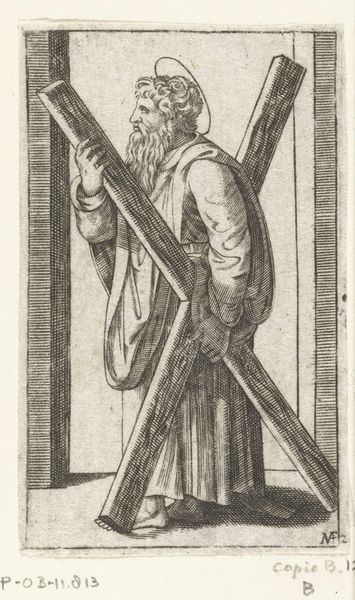 Crafted by Marcantonio Raimondi, around the 16th century, this engraving at the Rijksmuseum depicts the Apostle Andrew with his iconic cross. The composition centres on the Apostle, whose figure is meticulously rendered using fine, precise lines. The texture achieved through hatching and cross-hatching not only defines form but also contributes a palpable sense of depth and weight, especially noticeable in the drapery and the wooden cross. Semiotically, the cross is not merely a structural element but the chief signifier of Andrew's martyrdom and faith. The formal construction of the engraving invites us to consider the interplay between form and meaning, where the Apostle's steadfast bearing and the imposing cross evoke themes of sacrifice and devotion. Raimondi's masterful manipulation of line and tone elevates the work beyond a simple depiction, turning it into a profound visual statement about belief and the burdens of faith.