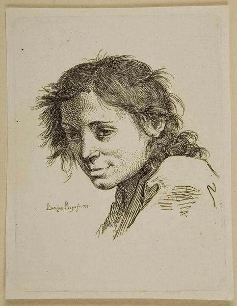 Curator: Benigno Bossi's "Head of a Boy, Profile Left" presents a rather intriguing young man. The sketch work is quite delicate, isn't it? Editor: Absolutely! It strikes me as melancholic, almost haunting, particularly in the way the lines around his eyes suggest a world-weariness. Curator: Perhaps. Or maybe he's just bored! I find his hairstyle particularly compelling; it lends him an air of nonchalant rebellion, don't you think? Editor: Perhaps a staged rebellion, a carefully crafted image of defiance for the upper classes. It's interesting to consider how youth and privilege are intertwined. Curator: I like your reading, as always! The artwork makes me reflect on the complexities of human expression and identity. Editor: For me, it's a reminder of the power dynamics inherent in portraiture, the often unspoken narratives of class and representation.