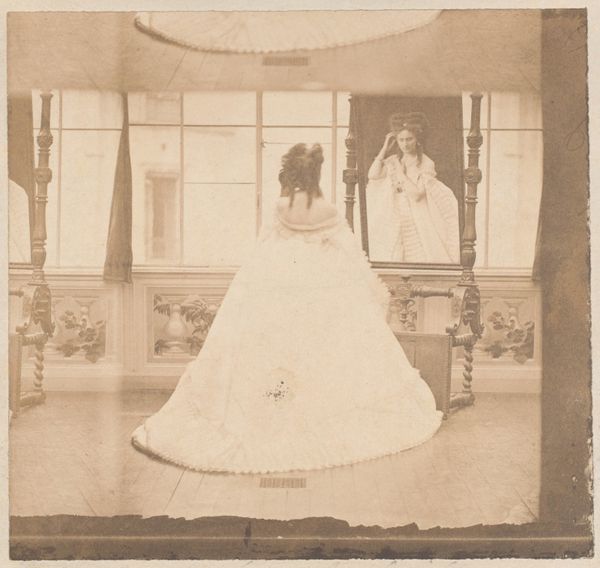 Curator: Welcome. Here we have "Twee bruiden," or "Two Brides," a stereoscopic gelatin-silver print, possibly with watercolor or colored pencil enhancements, created between 1856 and 1861. Editor: Immediately, the subdued palette strikes me—it evokes a wistful, almost melancholic atmosphere despite the supposed joyous occasion of a wedding. There's a stifling quality to the heavy veils. Curator: Indeed. Let's consider the composition. The duplicated image for the stereoscope creates a sense of depth, literally pulling the viewer into the scene. The brides, framed within what seems to be a staged interior, present an intriguing symmetry. Editor: I see the layering as representing the suppression of female identity within the institution of marriage. The brides are practically erased by their veils and opulent dresses, transformed into symbols of status, property almost. How complicit are these women, do you think? Curator: The photographic technique, though primitive by today's standards, contributes to the ethereal quality. The soft focus, the subtle gradations of light and shadow... it's as much about what is concealed as what is revealed. I see a clear intention to adhere to a particular style of portraiture in that era, but this artistic decision seems to run parallel to your interpretation. Editor: But isn’t that aesthetic choice itself telling? The "tasteful" or "respectable" presentation deliberately obscures the individual, instead emphasizing conformity and social expectations. And, the dual presentation offered through the stereoscopic process further compounds that concept. It’s as though they have become almost twins. Curator: I concede to your argument insofar as the artist's potential intention versus the impact and interpretation may differ. The duality itself highlights this phenomenon; both stand still in a mirrored construction of visual language. We could unpack that concept endlessly. Editor: Absolutely, this seemingly simple portrait unlocks a much deeper conversation about the constraints placed upon women during this era, and how such constraints are perpetuated—even in images designed to celebrate union and happiness. This reading gives nuance to these "Two Brides." Curator: Yes, this dialogue allows one to see past the mere "style" of the artwork; to engage the conversation—one that art should always engender. Thank you for exploring this dimension of this striking, little-known stereoscopic image with me.