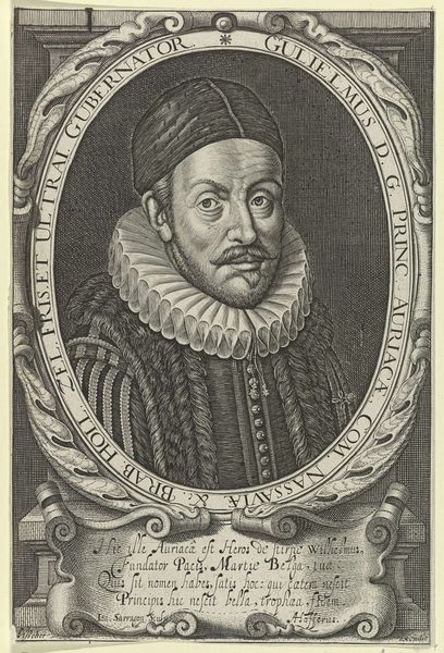 Curator: Dominicus Custos created this engraving, “Portret van Hieronymus Scotius,” in 1592. The print currently resides at the Rijksmuseum. Editor: My initial impression is that of constrained power. The intricate details and enclosed oval give a sense of formality and perhaps even confinement, despite the man's clear status. Curator: The historical context is essential here. Portrait engravings like this one were crucial in disseminating images of powerful figures. Scotius, as a member of the Piacenza elite, would have benefited greatly from the distribution of his likeness, reinforcing his position through carefully constructed visual propaganda. Editor: Yes, exactly. It is interesting how he is depicted not merely as an individual but almost as a representation of his lineage. I find it curious the emblem below featuring a writhing, medusa-like figure emerging from a hand, hinting at both control and perhaps something more chaotic or transgressive underneath the surface. Curator: I appreciate that interpretation. We should also note how Scotius’s gender and class are performed here through dress and adornment. The ruff, the doublet, even the extravagant hat all communicate specific codes of status within the visual language of the time. It tells us something about his engagement with early modern fashion and politics of courtly display. Editor: I also see a tension in his gaze, like there is some sort of unease behind the powerful appearance. Could that stem from religious turmoil? Scotius lived during a time of intense confessional division. Was this portrait designed, in part, to assert allegiance? The family insignia is another piece to be unraveled for hidden stories of loyalty. Curator: Portraits served precisely that function. It's intriguing how such seemingly static images can offer such profound insights into the political, social, and religious landscape of the past. Thank you, Dominicus Custos! Editor: It is always more that one could expect from an artwork like this print. The engraving goes well beyond just a visual, serving as a portal to the politics of identity.
