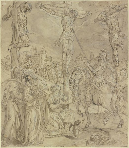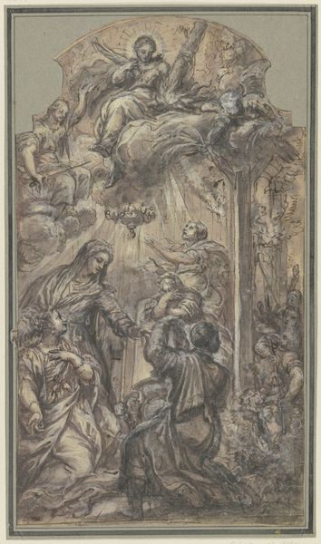 Curator: This is Gaspare Serenario's drawing, "Saint Benedict Orders the Destruction of Idols at Montecassino," likely created sometime between 1694 and 1759. It’s a striking ink drawing, currently held in the collection of the Metropolitan Museum of Art. Editor: It’s intense. A flurry of destruction, dominated by earth tones, conveying both violence and... piety? Is that a sword-wielding angel floating overhead? Curator: Yes, the angel with a sword definitely adds to the drama. But consider the composition as a whole. Serenario skillfully employs symbols of the triumph of Christianity. Note how St. Benedict stands serenely in the center, a beacon of order amid the chaos, while his followers dismantle pagan idols. It speaks volumes about power dynamics in the era. Editor: You are right. Benedict does dominate the frame, yet the destructive act feels ambivalent. The angel feels like a divine warrant for the iconoclasm unfolding below. But at the same time, the shattered idols at the feet of people carry stories, culture. Was all that destroyed so easily and completely? Curator: It wasn’t that simple, of course. Historical context is crucial here. This scene represents a pivotal moment in the establishment of the Benedictine order and the broader conversion of Europe. The physical act of destroying idols served as a powerful symbol of spiritual cleansing and societal transformation. We have a similar tradition reflected across culture and eras, really, of symbolically casting off the prior to step into the new, but not always through destruction like this... Editor: It does raise difficult questions about the suppression of belief. You make a good point that there are cultural commonalities in casting out the prior, so there’s a very charged symbolism at play here, even beyond the explicitly Christian content. Curator: Exactly. And beyond its historical and religious significance, I find the artwork technically impressive. Serenario masterfully uses ink to create depth and movement. The dynamic poses of the figures, the interplay of light and shadow… it all adds to the emotional intensity of the scene. Editor: It leaves me contemplating the complicated relationship between faith, power, and cultural memory, I appreciate this. Thanks for pointing out the artful and emotive detail amid such turmoil!