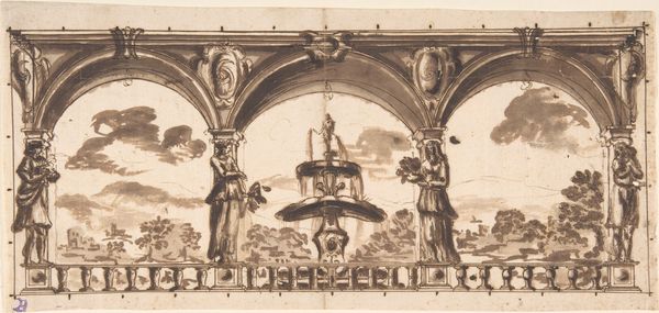 Editor: So this is an engraving from before 1800, titled "Rond bassin met kroon waaruit water spuit," or "Round basin with crown from which water spouts." It’s by an anonymous artist and held here at the Rijksmuseum. I'm struck by the intricacy of the lines, and it makes me think about the labor involved. What stands out to you about it? Curator: The dense linework immediately brings to mind the material reality of its creation. Consider the engraver, meticulously carving into a metal plate. Each line represents a deliberate action, a physical interaction with the material. Editor: Right, it's easy to forget the physical effort. Curator: Exactly. And beyond that, we must ask, for whom was this print made, and how would it be used? Was it a luxury item for the wealthy, or a tool for disseminating ideas about landscape design? The baroque style certainly speaks to grandeur. Editor: Good question, I suppose this kind of imagery spoke to the owner’s wealth? The landscape depicted seems very controlled, artificial. Curator: Precisely. It suggests a desire to master nature, to impose order upon it. Consider the materials – the stone, the water, the metal of the engraving plate. How are these materials being manipulated to project a specific ideology? The fountain itself becomes a symbol of power and control. And in turn, the print is symbolic, produced with a tool in a capitalist society. Editor: I see what you mean. Thinking about it this way shifts my focus. Curator: Indeed. By examining the means of production and the social context, we can move beyond aesthetics and delve into the work's deeper meanings and cultural function. It serves to challenge us, questioning the relationship between labor, material, and consumption. Editor: That makes a lot of sense. It definitely adds another layer to my understanding and appreciation of the piece. Curator: It does for me too. Examining the making process allows for so many more nuanced observations!