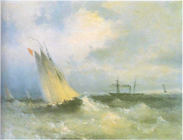 Curator: This painting before us is Ivan Aivazovsky's "Tempest by Coast of Nice," created in 1885. It's an oil painting that really captures the raw power of the sea. Editor: My first thought? It's turbulent! The subdued palette of grays and browns really conveys the threatening atmosphere. It's the kind of scene that makes you instinctively want to find shelter. Curator: Absolutely, and it's vital to consider Aivazovsky's broader artistic output. He was, after all, the principal artist of the Russian Navy, and this aligns with his extensive exploration of maritime themes and a reflection of the historical context in which naval power held significance. Yet it evokes deeper questions about human vulnerability against nature's power, about the societal implications of dependence on an element that can be both life-giving and destructive. Editor: Indeed. Thinking about it from an art historical perspective, this piece falls squarely within the tradition of Romantic landscape painting. But instead of the sublime beauty often depicted, we get something far more ominous. It really shows how social attitudes shifted to appreciate not only tranquility but also raw nature. The sea wasn't just picturesque; it was also a force that determined fates. Curator: That's a salient point. Consider also the lack of explicit narrative. While some figures struggle aboard the distant vessel, we're denied easy answers. We must ask: Who are they? What historical forces conspired to bring them here, into conflict with this unrelenting force of nature? We can interpret the work through various cultural studies lenses to reveal underlying power dynamics. Editor: Precisely. The blurred distinction between sea and sky heightens the disorientation. It mirrors the broader social anxieties around industrialization and its impact on the natural world during that time, a changing of the established order. One can only imagine what sort of sociopolitical instability resulted in the ship's ill fortune! Curator: By positioning the human-scaled ship as tiny versus nature's fury, he critiques imperialism and unchecked exploitation, making it quite a politically charged work, wouldn't you say? Editor: Yes, viewing "Tempest by Coast of Nice" allows us to consider Romanticism's evolving role in addressing contemporary anxieties, a shift clearly reflected in its popularity among diverse audiences. Curator: Thank you; that helps contextualize its broader significance, prompting us to ask difficult questions. Editor: Thank you; it highlights how landscape art reveals a more complex sociopolitical discourse than previously believed.